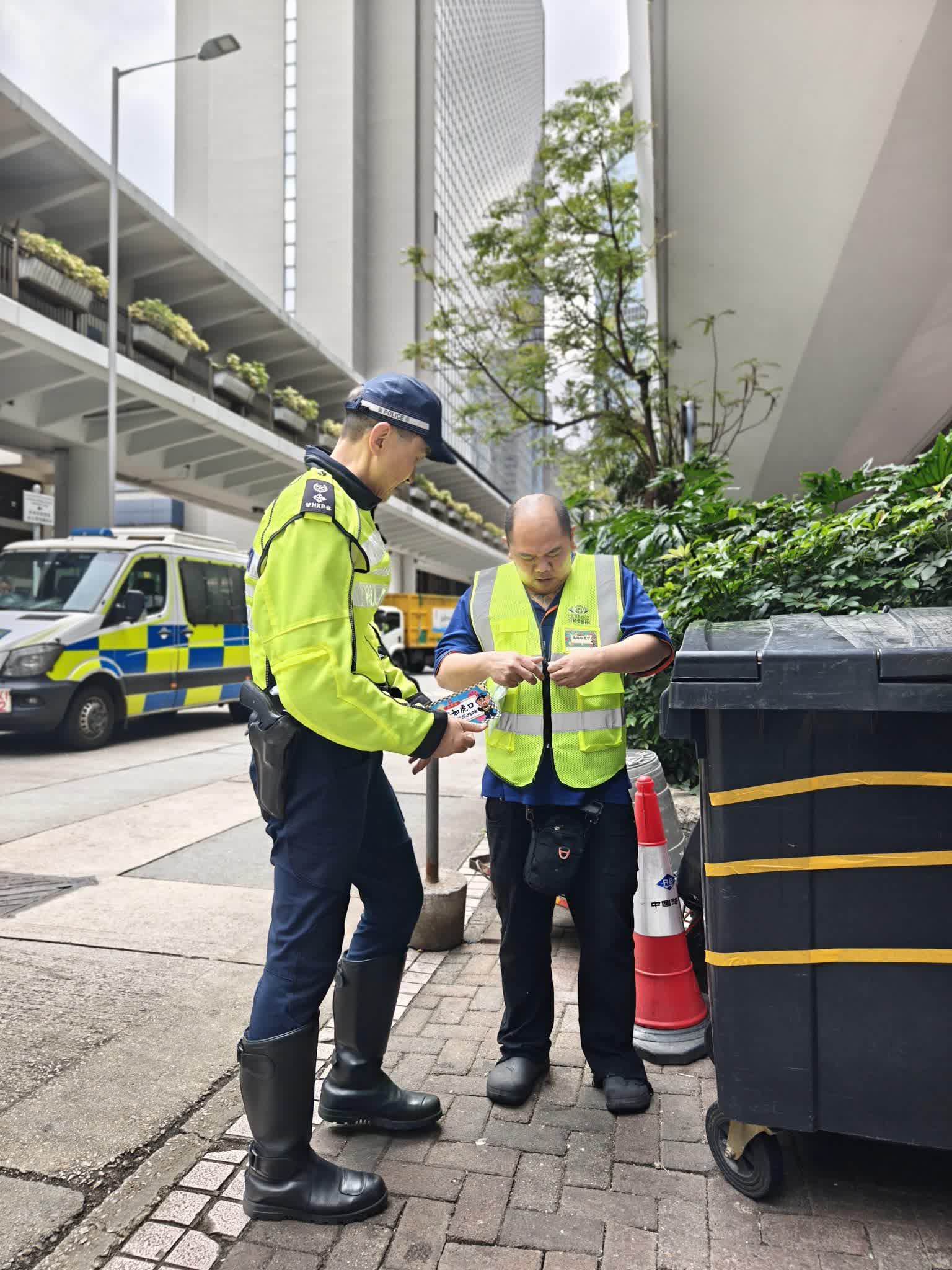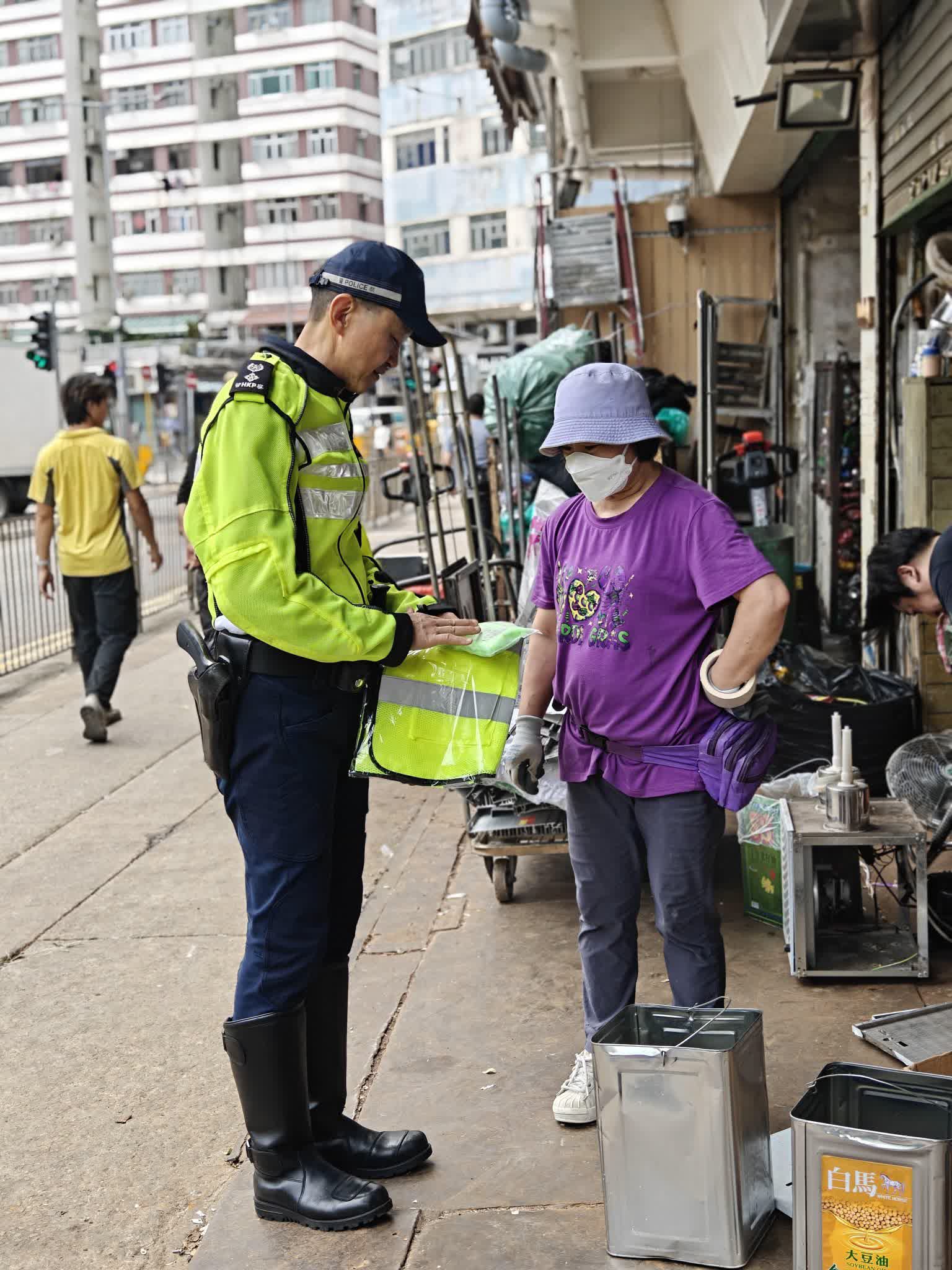 香港文匯報訊(記者 蕭景源)警方港島總區交通部人員今日(31日)在中環、灣仔及鰂魚涌進行道路安全宣傳活動,向清潔工人及回收從業員派發反光背心和手袖,提醒他們提升可視度,尤其是夜晚或落雨時穿著反光衣,可讓司機更容易見到他們,從而減低意外風險 。