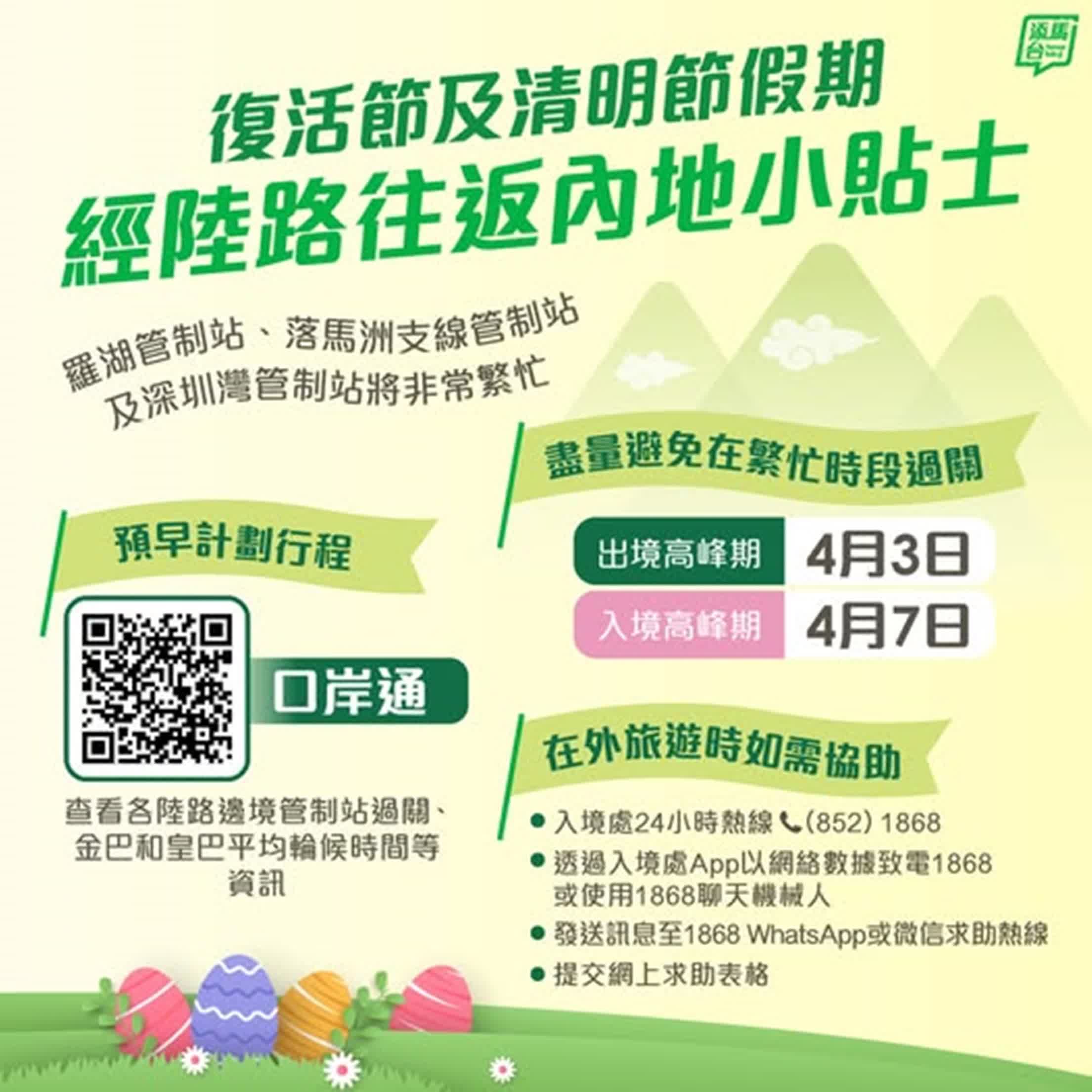 入境處呼籲所有經陸路往返內地的旅客應預早計劃行程,盡量避免選擇在繁忙時段過關,並留意有關各邊境管制站交通情況的電台或電視廣播。市民及旅客亦可瀏覽保安局推出的一站式過關資訊平台「口岸通」(www.sb.gov.hk/chi/bwt/status.html?type=outbound),一次過取得各陸路邊境管制站旅客和私家車過關平均輪候時間,以及港珠澳大橋過境穿梭巴士(金巴)和落馬洲—皇崗過境穿梭巴士(皇巴)的平均輪候時間等有用資訊,以便計劃行程及減省等候時間。