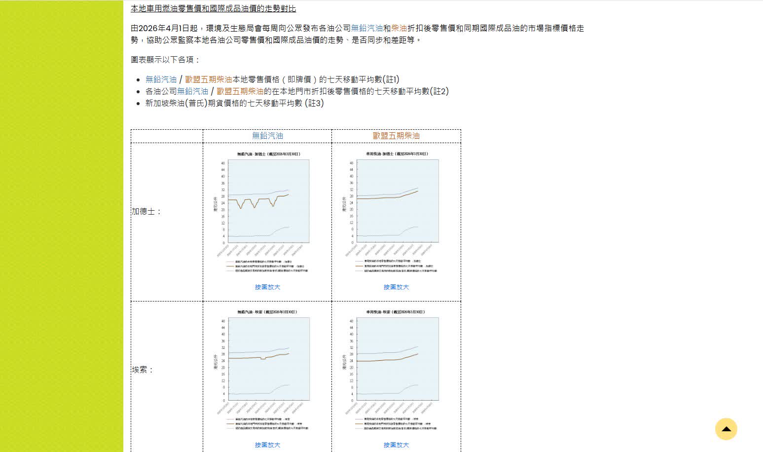 環境局指,原油與成品油是不同的產品,國際原油價格(例如倫敦布蘭特原油)的變動與車用燃油零售價的調整未必同步。環境局在走勢圖表,採用國際成品油的市場指標價格與車用燃油零售價格作比較,協助公眾監察本地各油公司零售價和國際成品油價的走勢、是否同步和差距等。
