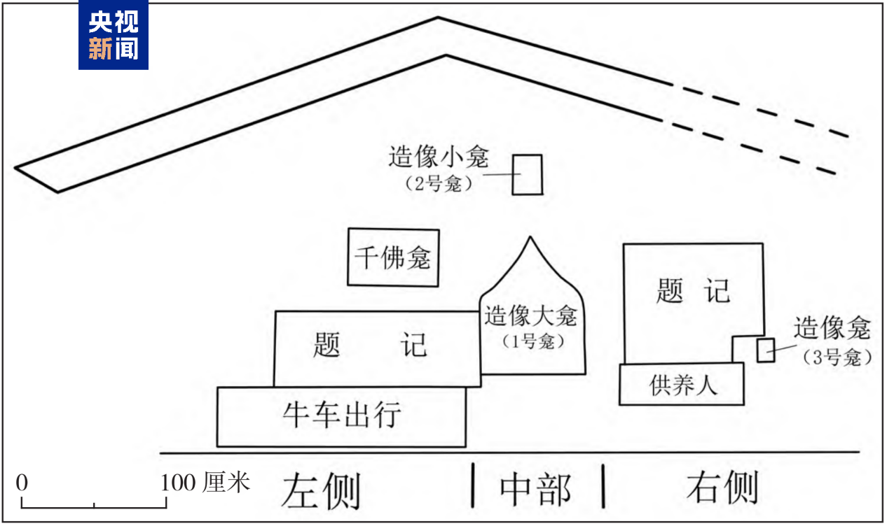 摩崖造像位于崖壁中部,正中为造像大龛,千佛龛、发愿文及供养人题记等围绕大龛展开。