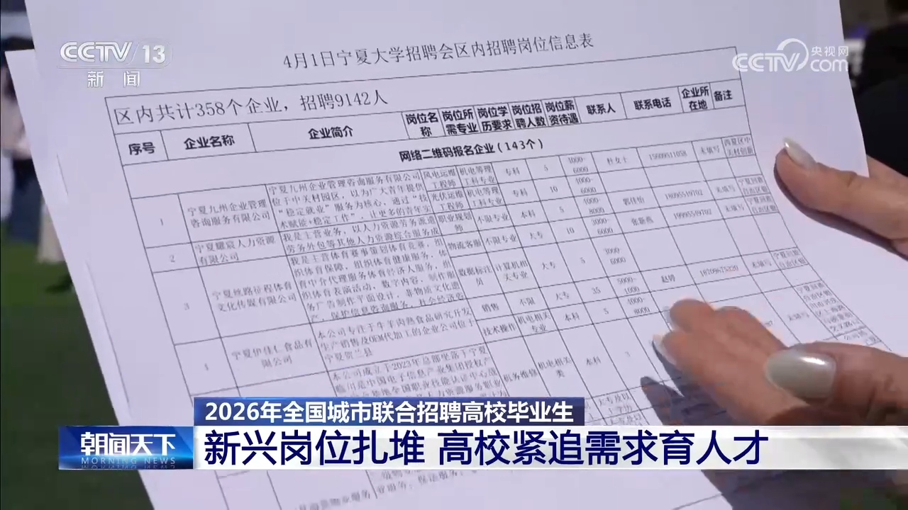 总台央视记者 唐蕾:我现在在宁夏银川的2026年全国春招启动仪式的现场,今天(4月1日)一共有1.1万多个岗位,从我手中的招聘岗位信息表可以看出,能源化工和新材料的岗位占了42%,人工智能、数字经济相关的前沿科技领域也备受求职者青睐。