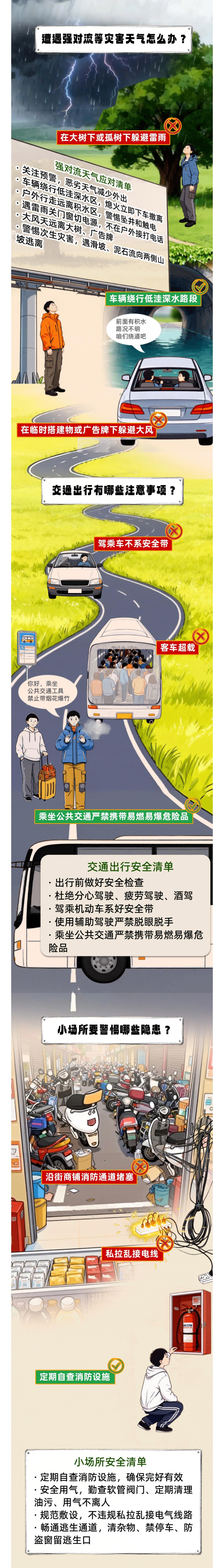 关注预警,恶劣天气减少外出;车辆绕行低洼深水区,熄火立即下车撤离;户外行走远离积水区,警惕坠井和触电;遇雷雨关门窗切电源,不在户外接打电话;大风天远离大树、广告牌;警惕次生灾害,遇滑坡、泥石流向两侧山坡逃离。