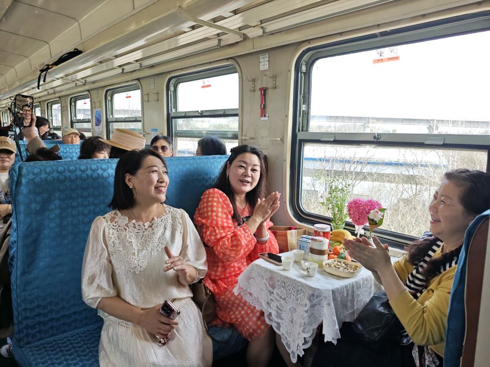 小小的方桌上,铺着白色桌布。窗边摆着心形插花,还有瓜子、砂糖橘、茶水。武汉市民秦晓晓和朋友们把下午茶搬上了火车。“生活要有仪式感,我们带着自己做的手工艺品,打卡花开的季节,拍些好看的照片。”秦晓晓说。