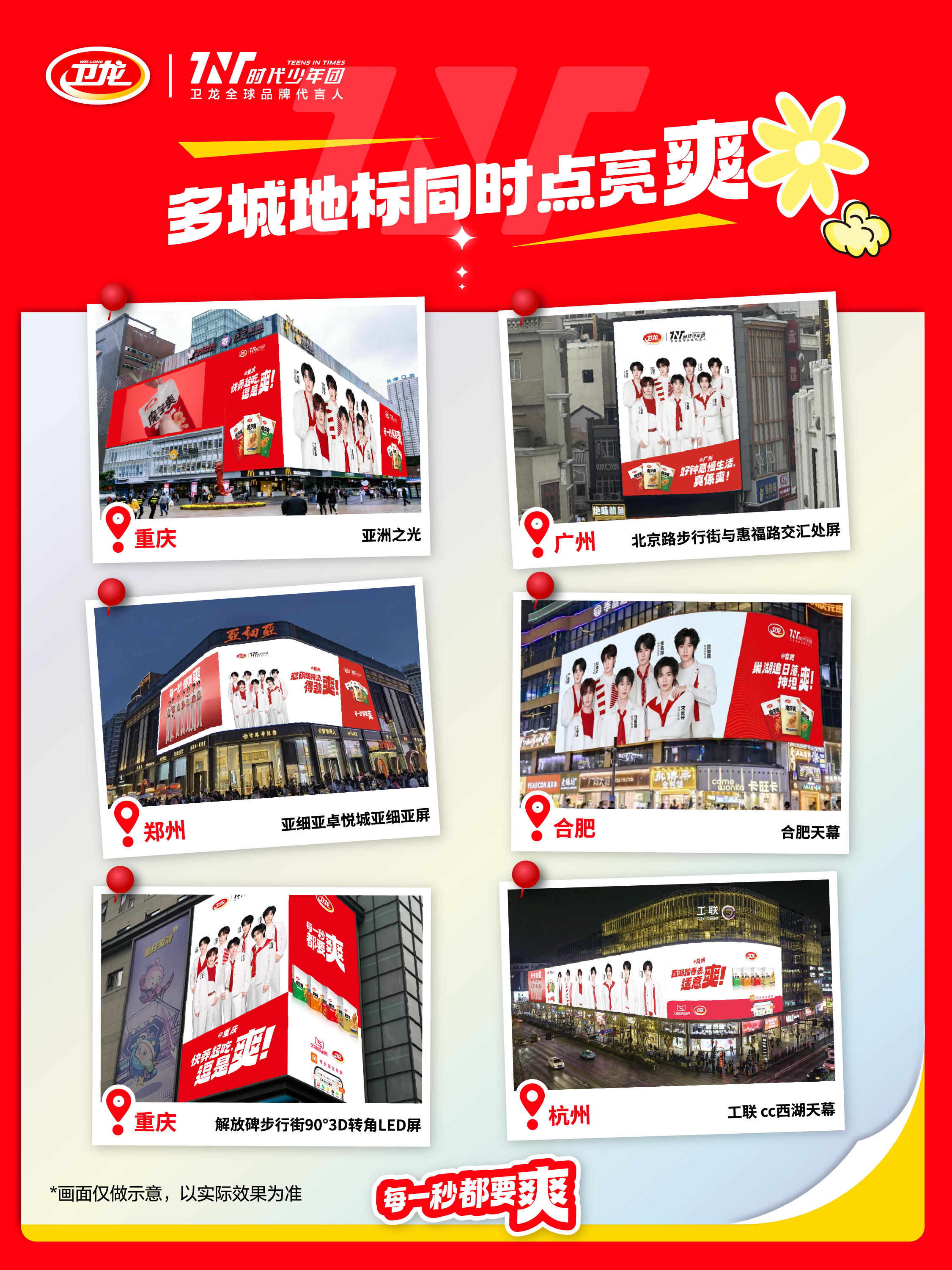 线上热度拉满,线下造势同步发力。官宣当日,卫龙携时代少年团代言形象率先点亮北京、上海、广州、重庆、成都、郑州、杭州7城核心商圈地标大屏,后续全国18城22块核心商圈大屏也将陆续上线,打造超吸睛视觉盛宴。此次大屏,巧妙结合各城市的方言特色与地域文化定制专属“爽系”文案,赋予鲜明的地域特性与烟火气,让卫龙的“辣爽态度”与少年活力席卷全国。