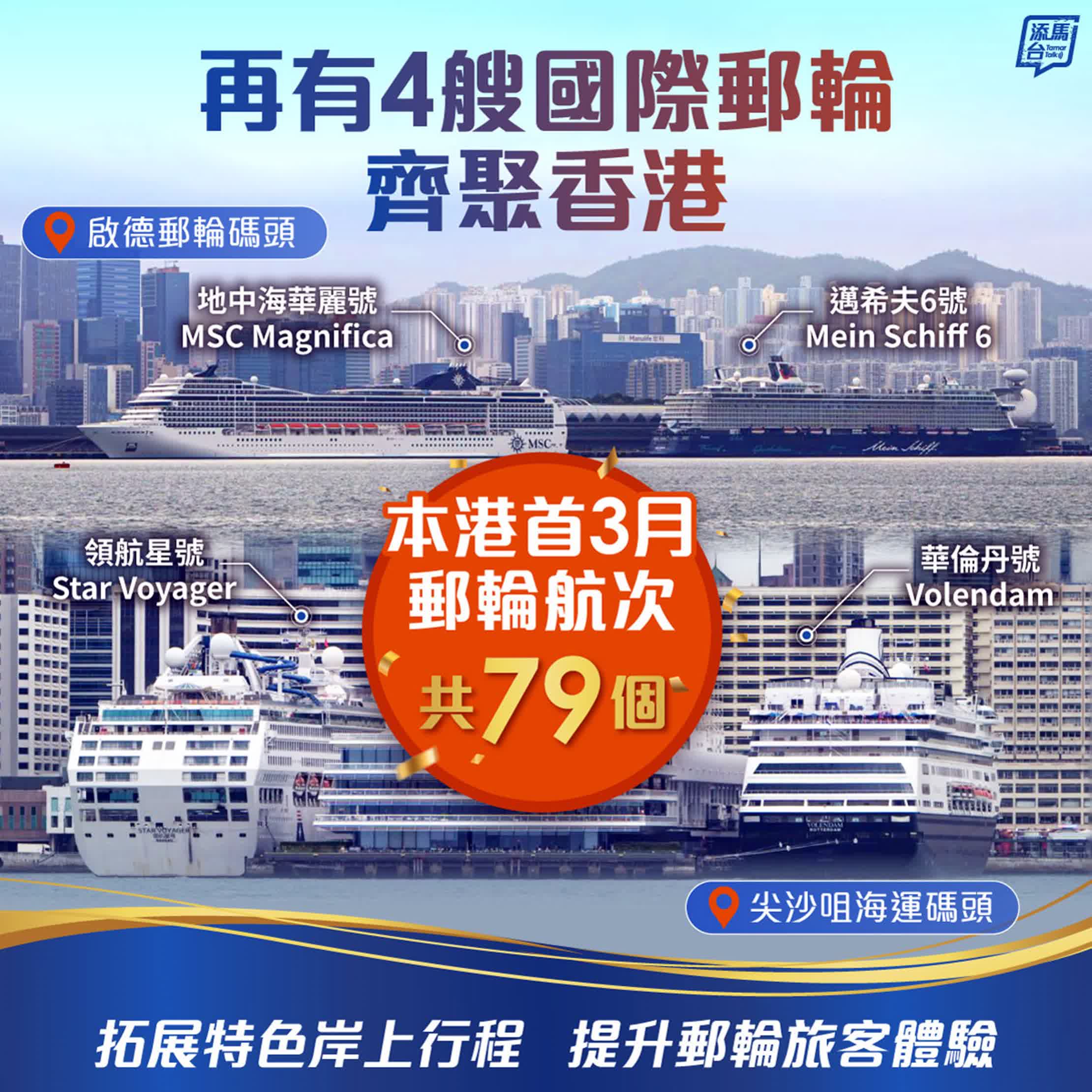 香港文匯報訊(記者 蕭景源)香港郵輪業繼續展現強勁活力,繼上周五(3月27日)有4艘國際郵輪訪港,昨日(4月1日)再次「四船齊聚」,有4艘國際郵輪同時停泊香港,分是華倫丹號Volendam、邁希夫6號Mein Schiff 6、地中海華麗號MSC Magnifica,以及領航星號Star Voyager。本港今年首3個月已合共迎來79個郵輪航次,預計全年將有超過30個郵輪品牌訪港。