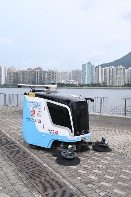 食物環境衞生署展出自去年6月起於沙田馬料水海濱行人道試行的「自動清掃機械人」。機械人配備光學雷達、超聲波感測器及相機,能自動檢測及避開障礙物,並發出聲光警報提醒途人,有助提升工作效率及減輕前線員工體力消耗。