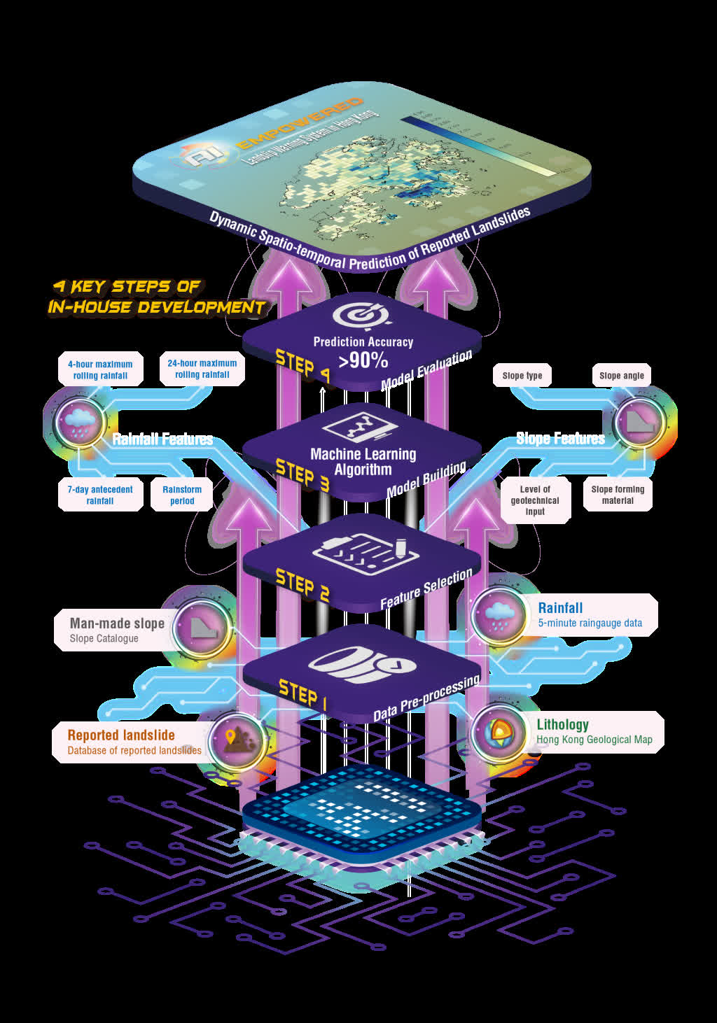 「AI+ 安全保障」展區展示多項預警與防災技術。土木工程拓展署自主研發的「人工智能山泥傾瀉警告系統」,透過分析實時雨量數據,動態估算山泥傾瀉報告數目,預測準確度超過九成。系統已於去年成功試行,將於今年全面應用,優化山泥傾瀉警告發放。