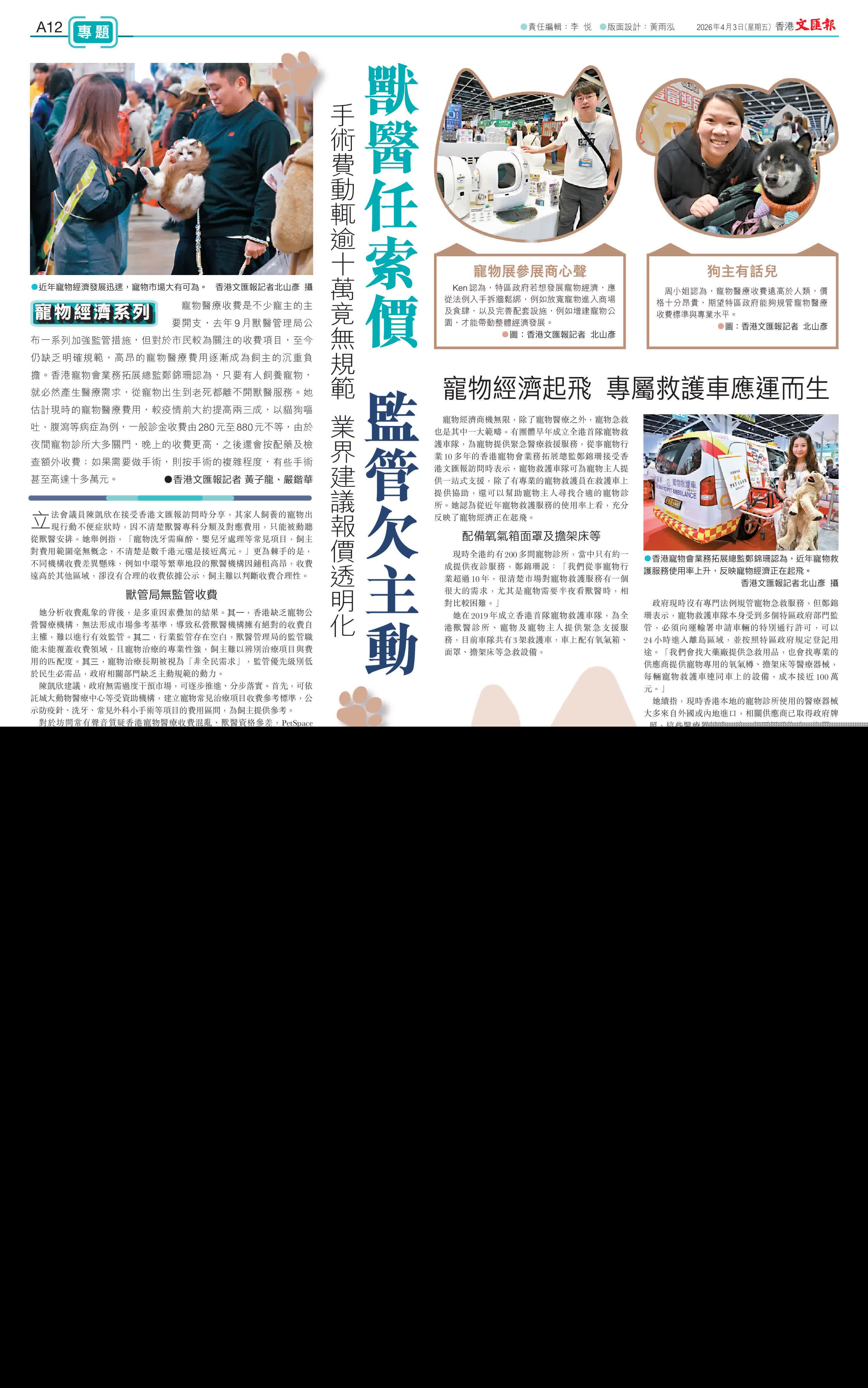 在收費方面,她認為行業需推動更透明的報價機制,未來若能通過政府與業界的共同努力,做好宣導與透明化建設,在規管與市場彈性間找到最佳平衡,便能既保障寵物的就醫權益,也維持整個行業的健康可持續發展。