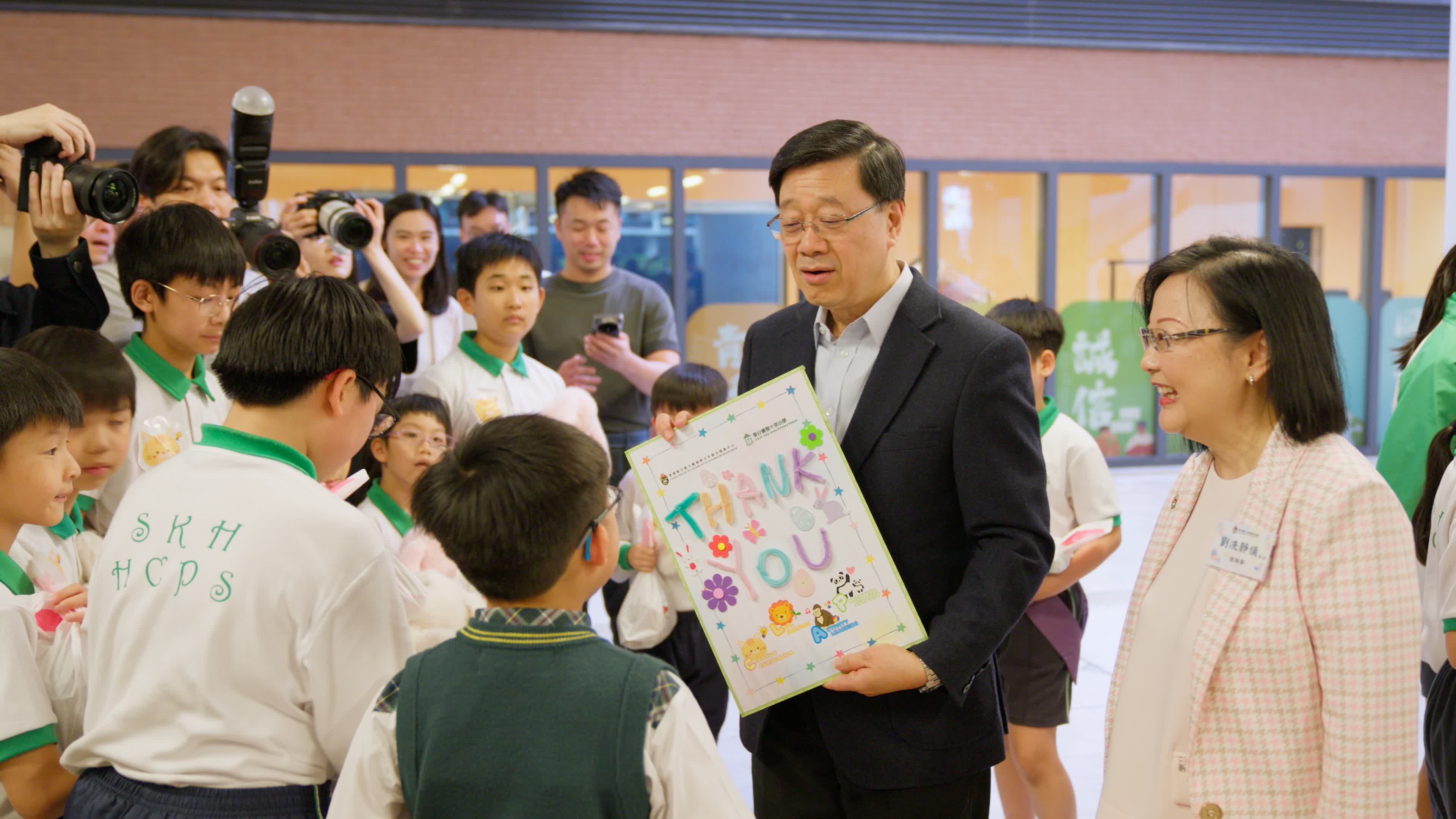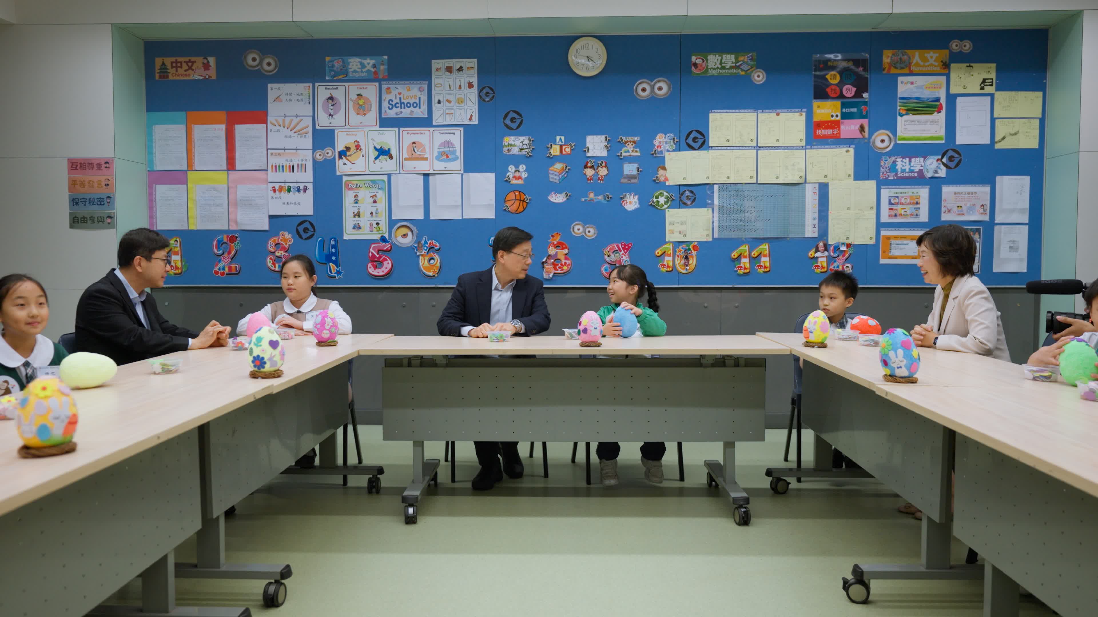 李家超到訪的學校夥拍非政府機構正推行「在校課後託管服務計劃」,順道視察計劃運作情況。參與計劃的學生放學後,在導師指導下完成功課及溫習,亦會進行遊戲及課外活動。他觀看了導師為學生作繪本講解,又在他們進行躲避盤遊戲時參與其中。