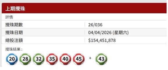 香港文匯報訊 六合彩復活節金多寶攪珠號碼結果為:20、28、32、35、40、45,特別號碼:43