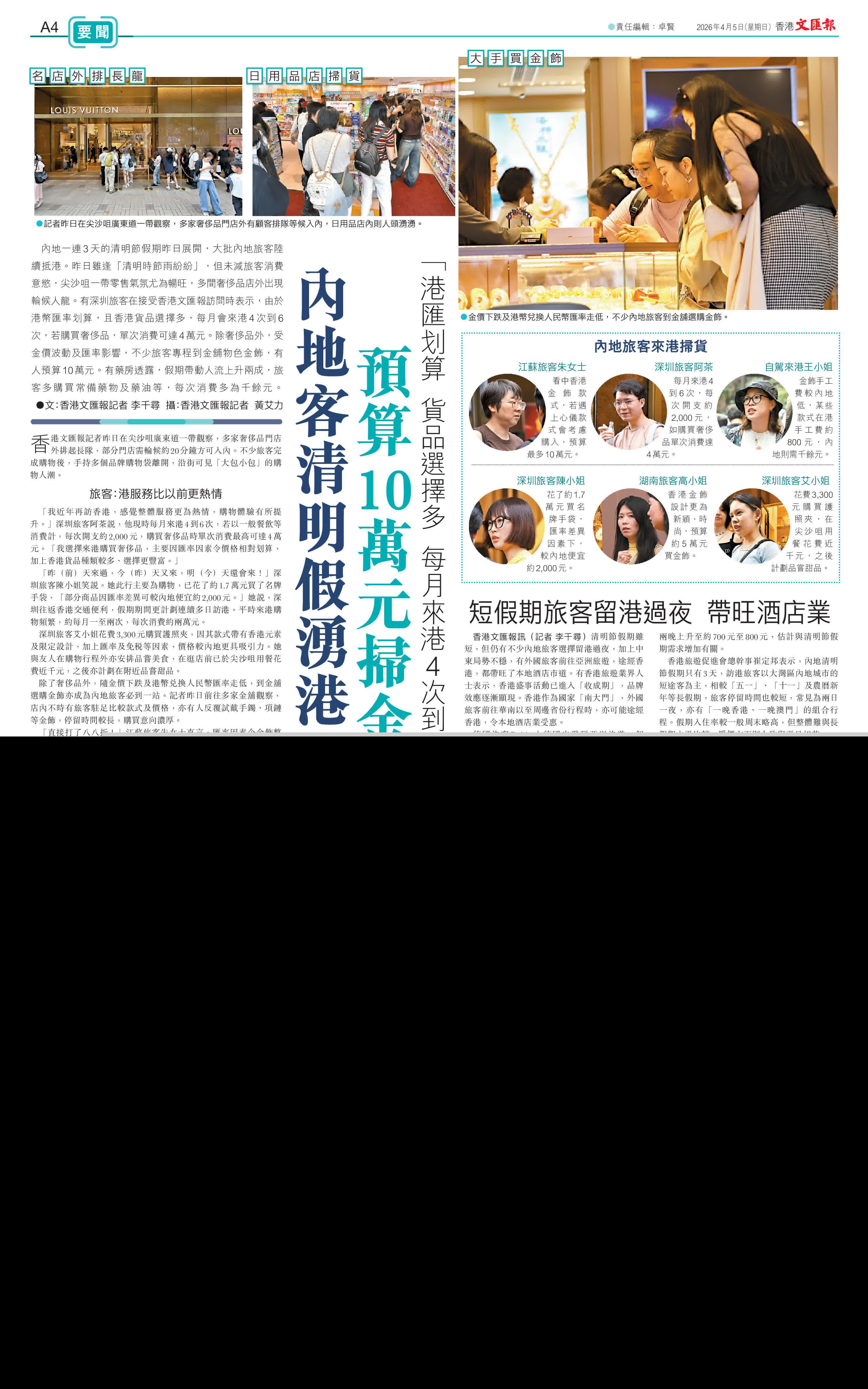 (文:香港文匯報記者 李千尋 攝:香港文匯報記者 黃艾力)內地一連3天的清明節假期昨日展開,大批內地旅客陸續抵港。昨日雖逢「清明時節雨紛紛」,但未減旅客消費意慾,尖沙咀一帶零售氣氛尤為暢旺,多間奢侈品店外出現輪候人龍。有深圳旅客在接受香港文匯報訪問時表示,由於港幣匯率划算,且香港貨品選擇多,每月會來港4次到6次,若購買奢侈品,單次消費可達4萬元。除奢侈品外,受金價波動及匯率影響,不少旅客專程到金舖物色金飾,有人預算10萬元。有藥房透露,假期帶動人流上升兩成,旅客多購買常備藥物及藥油等,每次消費多為千餘元。