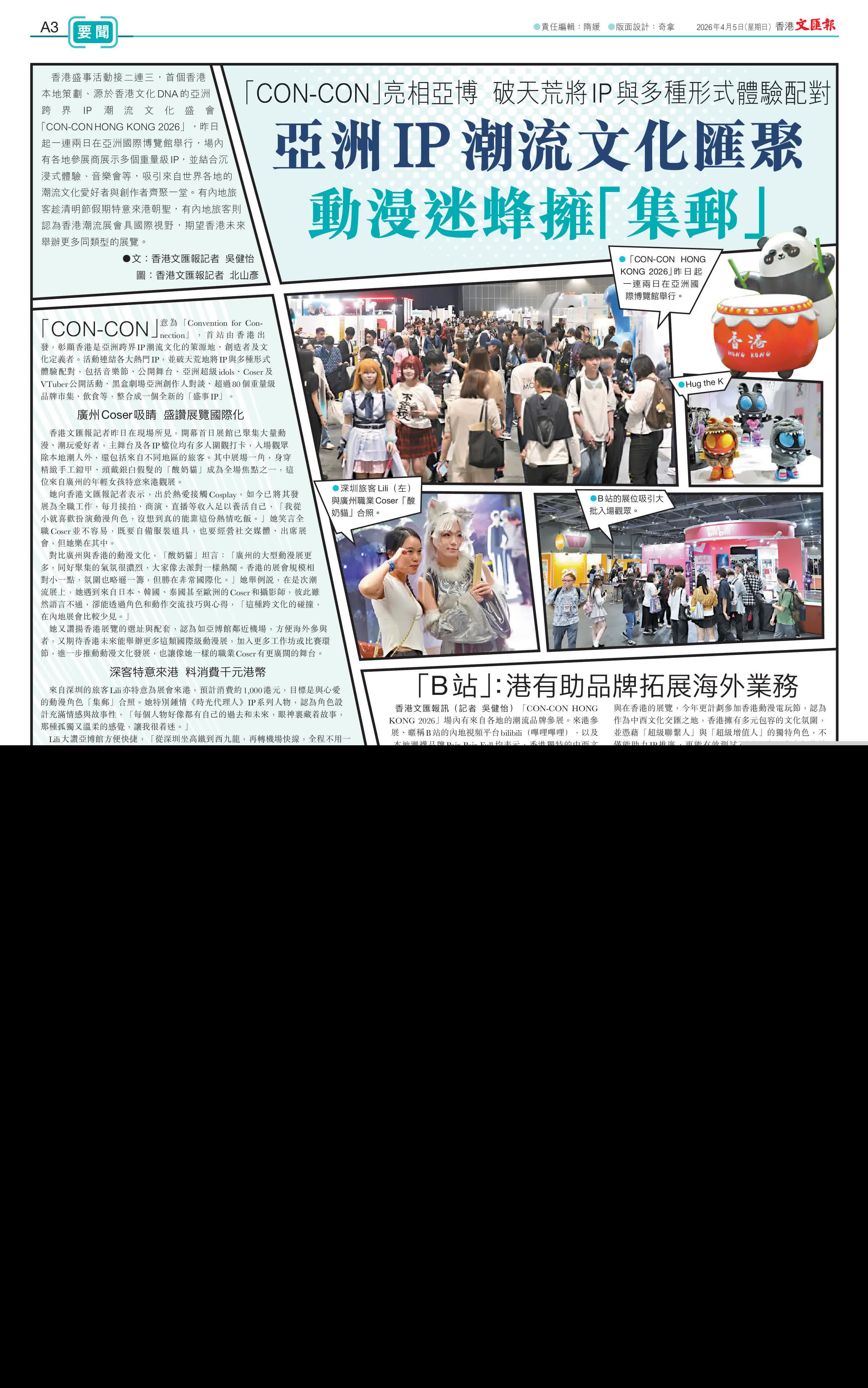 香港文匯報訊(記者 吳健怡)「CON-CON HONG KONG 2026」場內有來自各地的潮流品牌參展。來港參展、暱稱B站的內地視頻平台bilibili(嗶哩嗶哩),以及本地潮襪品牌Pair Pair Full均表示,香港獨特的中西文化交匯地位以及「超級聯繫人」等角色,有助品牌測試國際市場、拓展海外業務,實現「品牌出海」。