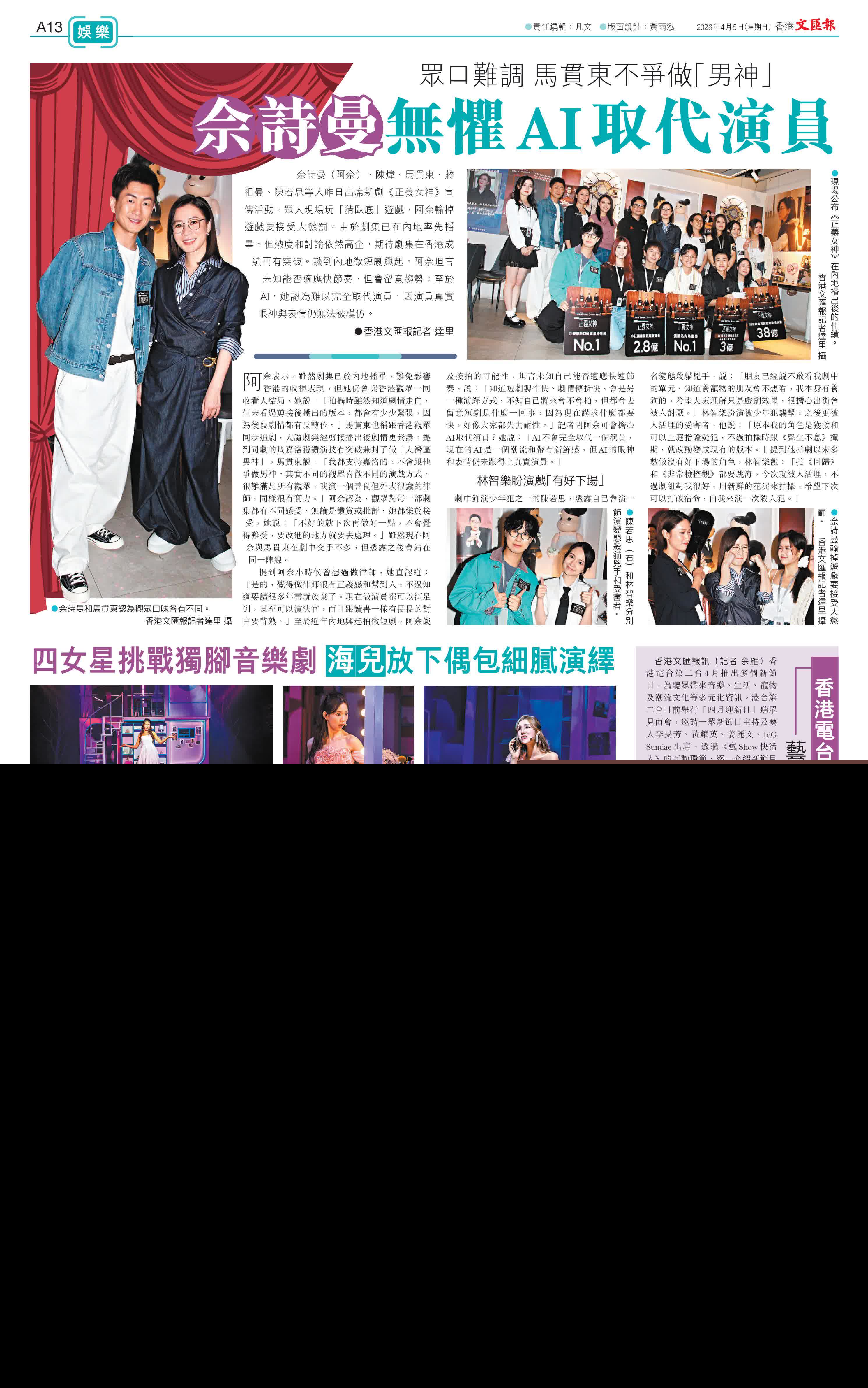 提到阿佘小時候曾想過做律師,她直認道:「是的,覺得做律師很有正義感和幫到人,不過知道要讀很多年書就放棄了。現在做演員都可以滿足到,甚至可以演法官,而且跟讀書一樣有長長的對白要背熟。」至於近年內地興起拍微短劇,阿佘談及接拍的可能性,坦言未知自己能否適應快速節奏,說:「知道短劇製作快、劇情轉折快,會是另一種演繹方式,不知自己將來會不會拍,但都會去留意短劇是什麼一回事,因為現在講求什麼都要快,好像大家都失去耐性。」記者問阿佘可會擔心AI取代演員?她說:「AI不會完全取代一個演員,現在的AI是一個潮流和帶有新鮮感,但AI的眼神和表情仍未跟得上真實演員。」