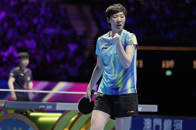 北京时间4月5日晚,国际乒联单打世界杯女单决赛,孙颖莎4-1战胜王曼昱,卫冕冠军,实现该项赛事“三连冠”。(总台记者 刘冰清)