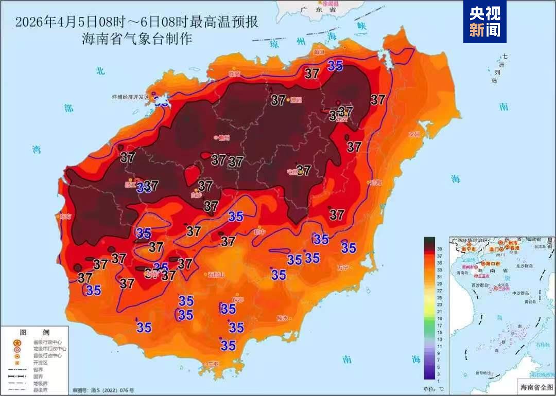 海南省气象局4月5日下午继续发布高温四级预警:预计4月6日白天,海口、澄迈、临高、定安、屯昌、儋州、白沙、昌江和东方等9个市县的大部分乡镇将出现37℃以上的高温天气,请有关单位做好防暑降温、森林防灭火等相关工作。
