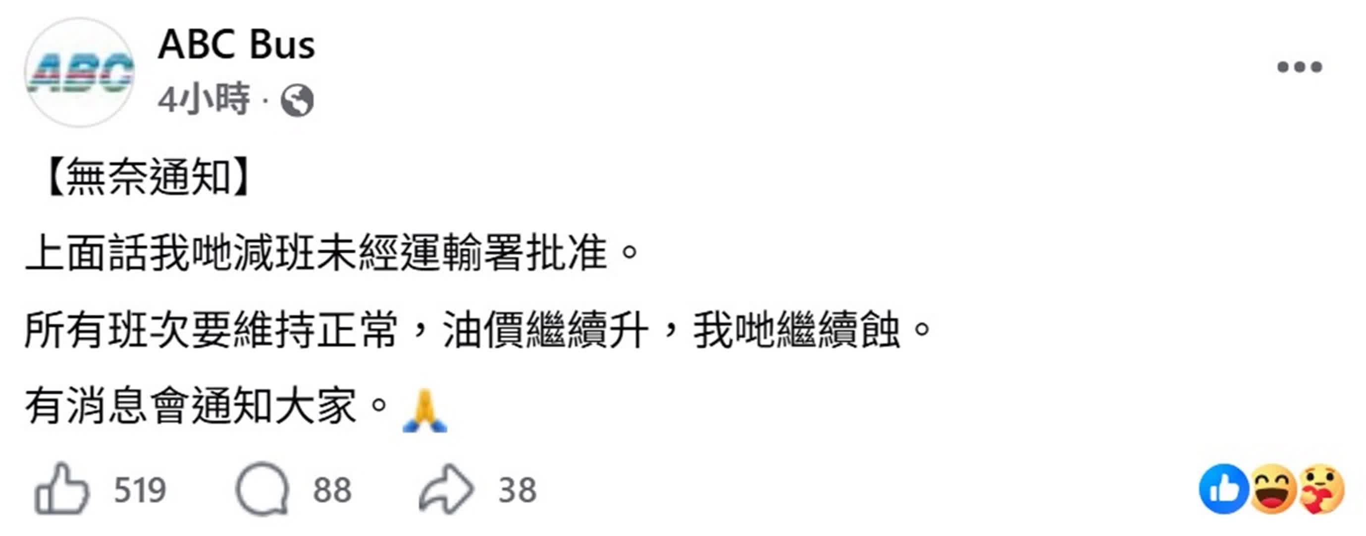 ABC旅運則於今日傍晚約6時29分再度貼文指,「上面話我哋減班未經運輸署批准。所有班次要維持正常,油價繼續升,我哋繼續蝕。有消息會通知大家。」