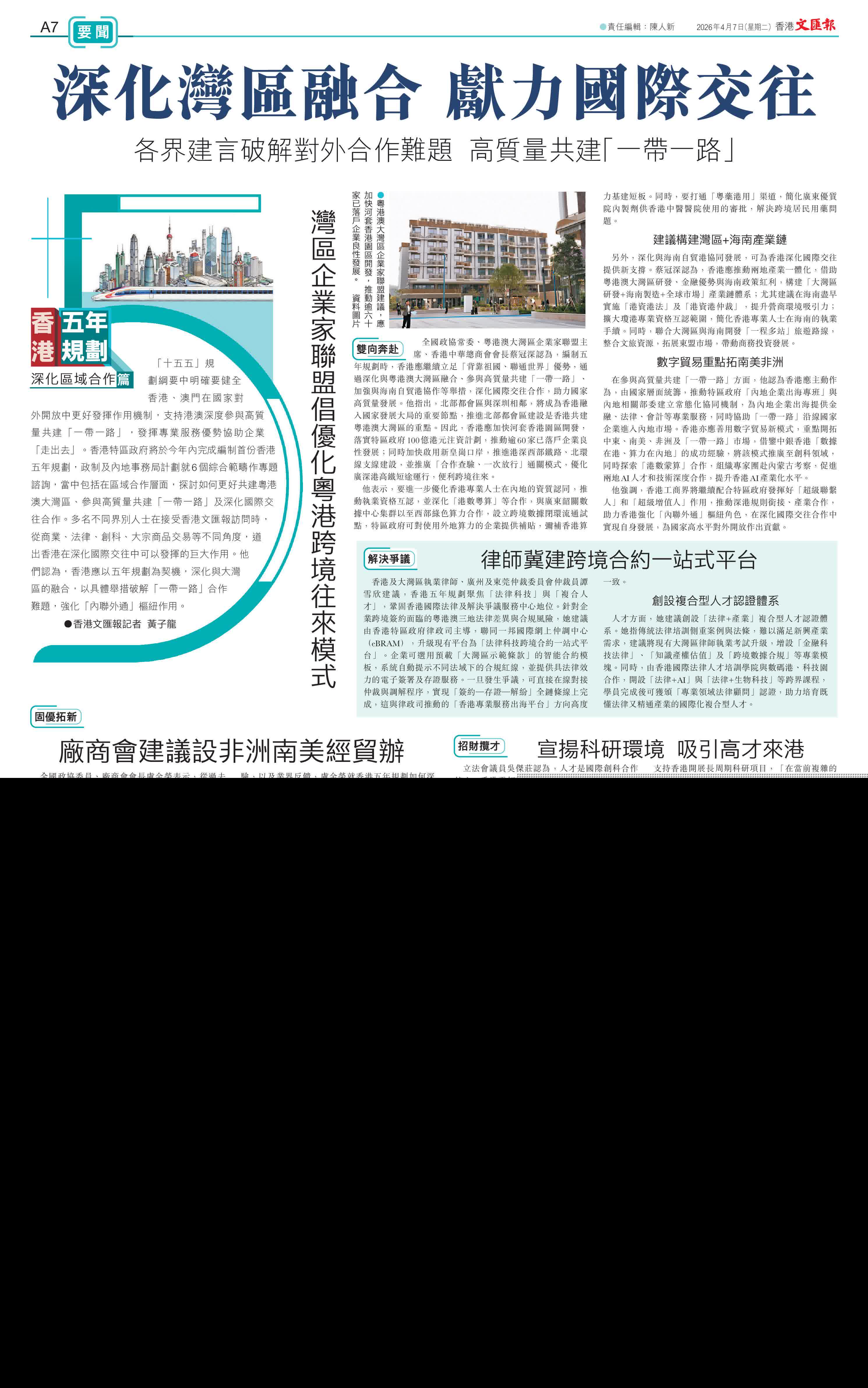 他認為,香港應以五年規劃為契機,深化與大灣區的融合,以具體舉措破解「一帶一路」合作難題,強化「內聯外通」樞紐作用,在深化國際交往合作中鞏固既有優勢、主動應對外部挑戰,助力國家高水平對外開放,同時實現自身高質量發展。