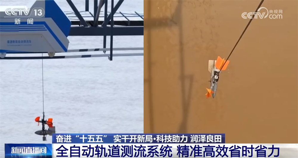 通过画面可以看到,记者身后有一座横跨干渠的测量桥,桥上正在运行的是一台自动测流车。它可以按预设程序自动行驶至指定位置,将测流仪放入干渠水流中,实现渠道断面流速、水位、流量等参数的全自动采集与分析。相较传统测量方式,节省时间50%以上,测流精度提高3%。