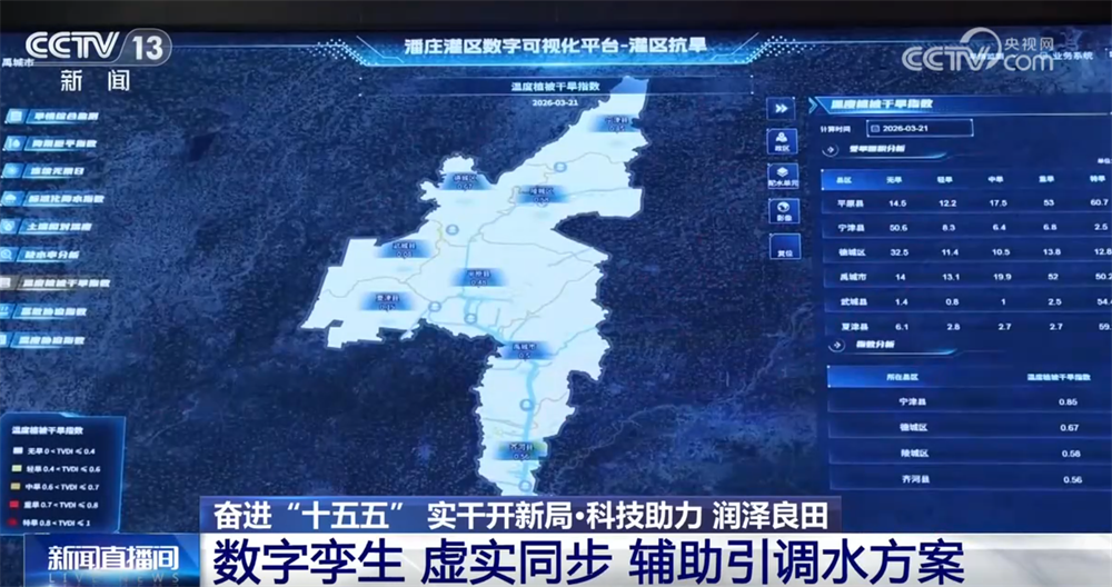 大家看记者身旁的展板,显示着数字孪生系统生成的今年2月、3月的墒情遥感检测对比,可以看到,一个月内,墒情变化较大。当地便依托数字孪生平台,根据墒情、苗情变化,运用AI水动力仿真模型对潘庄灌区520万亩耕地的配水方案进行三维预演,实施精准配水。据测算,有了智能系统辅助,相同时间内,潘庄灌区可扩大灌溉面积10%以上,一个灌溉周期节水近4000万立方米,约等于33个大明湖的蓄水量。
