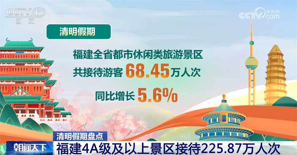 这个清明假期,福建省监测的4A级及以上景区累计接待游客225.87万人次,实现门票收入3569.72万元;全省都市休闲类旅游景区共接待游客68.45万人次,同比增长5.6%。