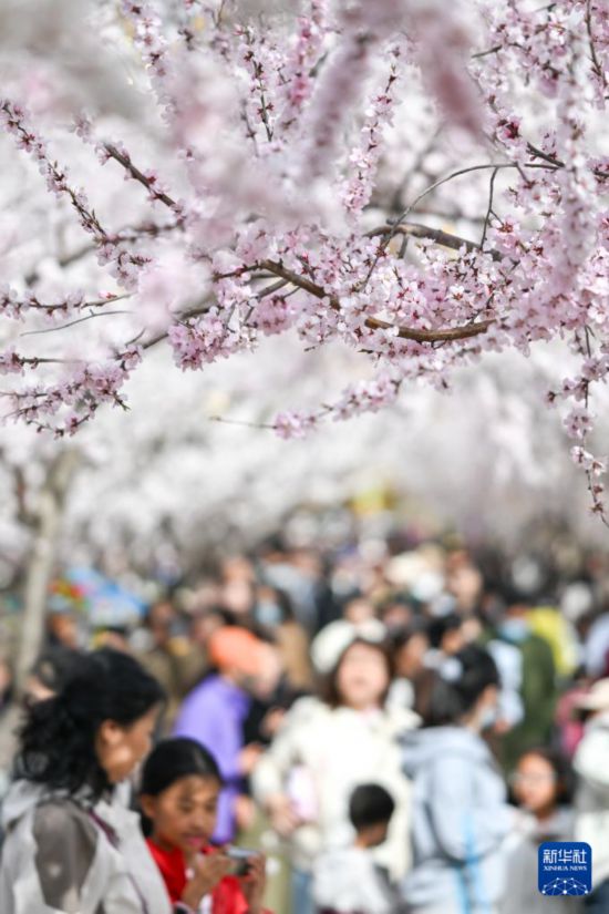 近日,随着气温回升,内蒙古呼和浩特市公主府公园的桃花陆续开放,吸引了众多市民前来踏青赏花。