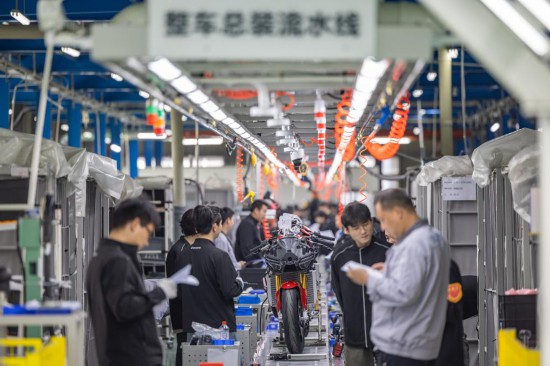 2026年4月1日,工作人员在重庆两江新区“张雪机车”生产车间整车总装流水线上作业。新华社记者 黄伟 摄
