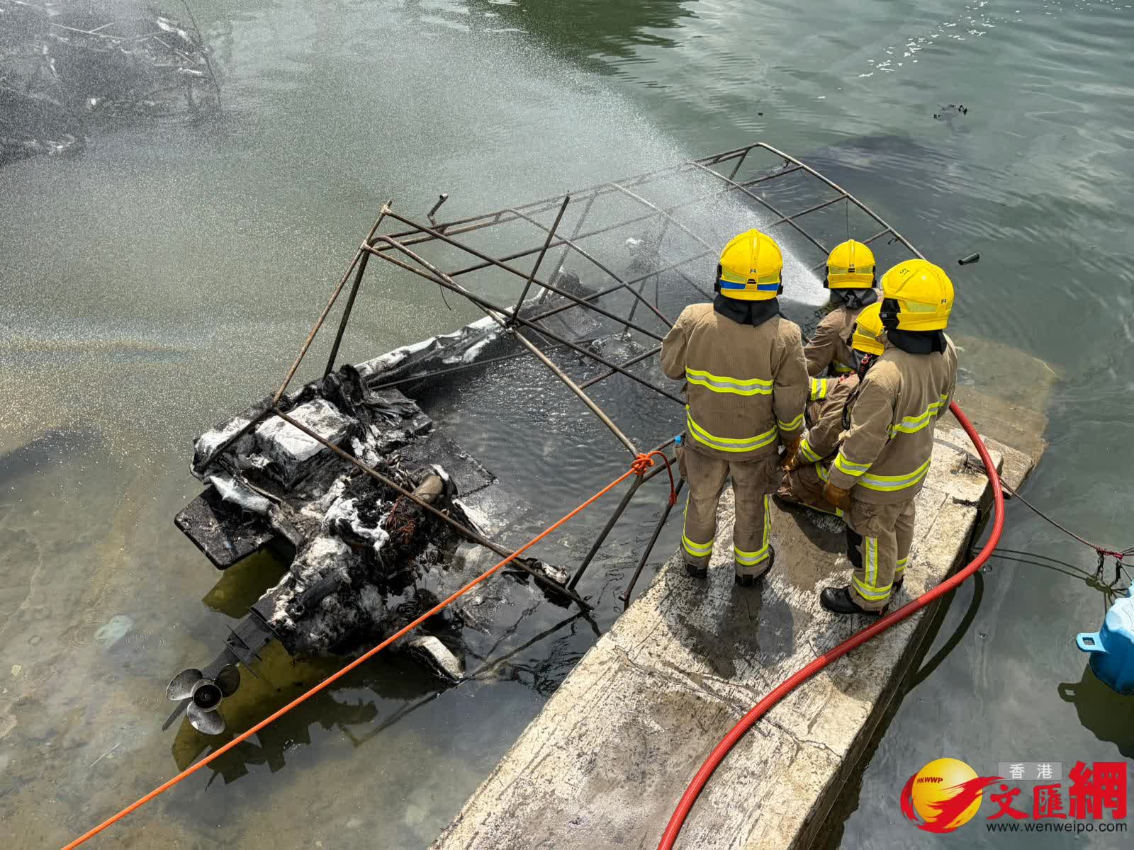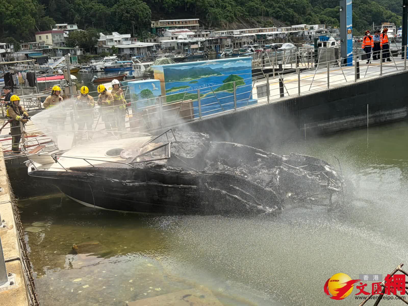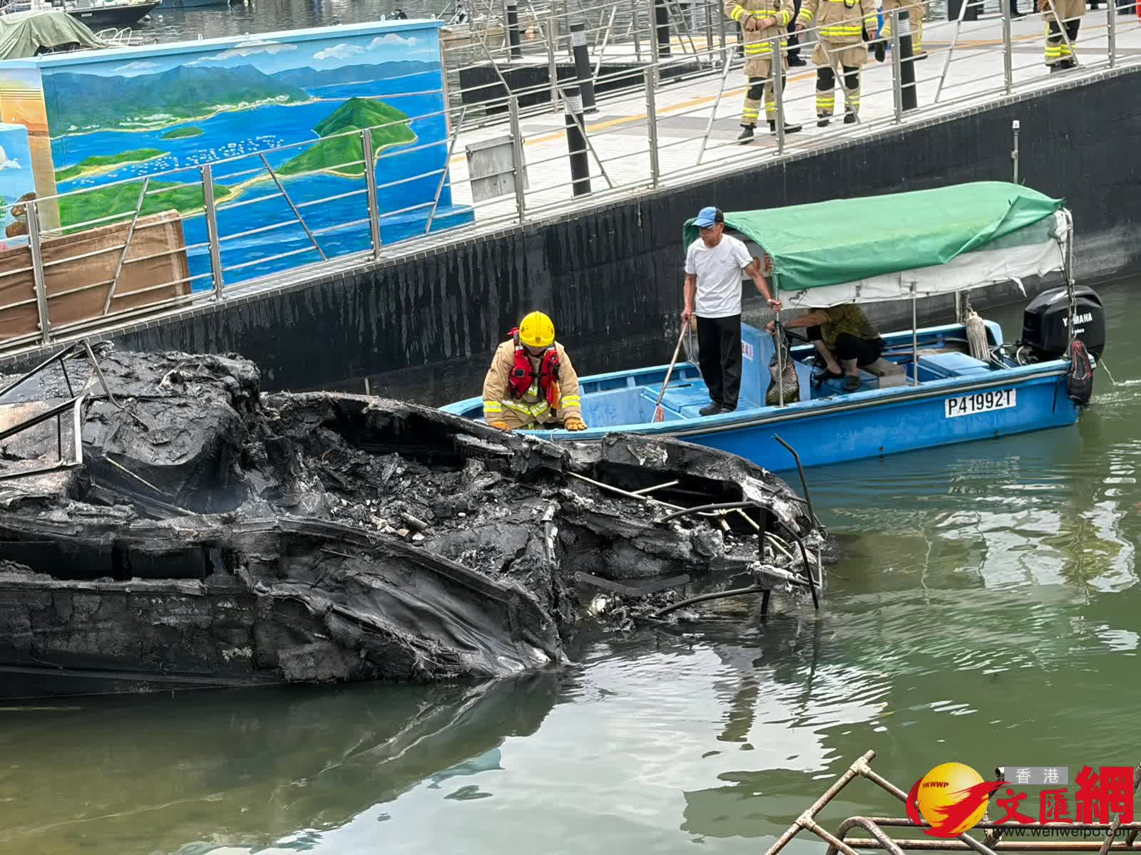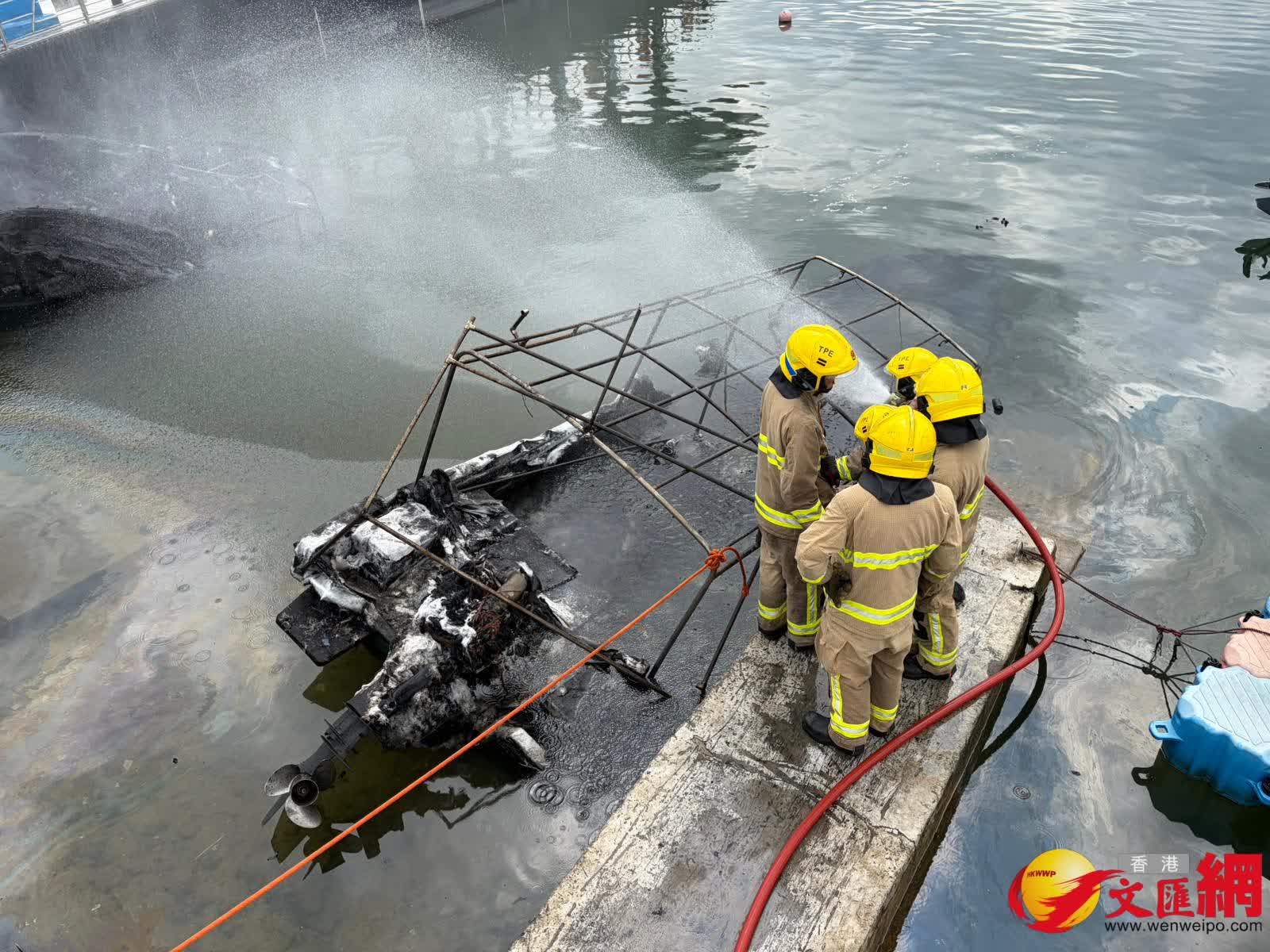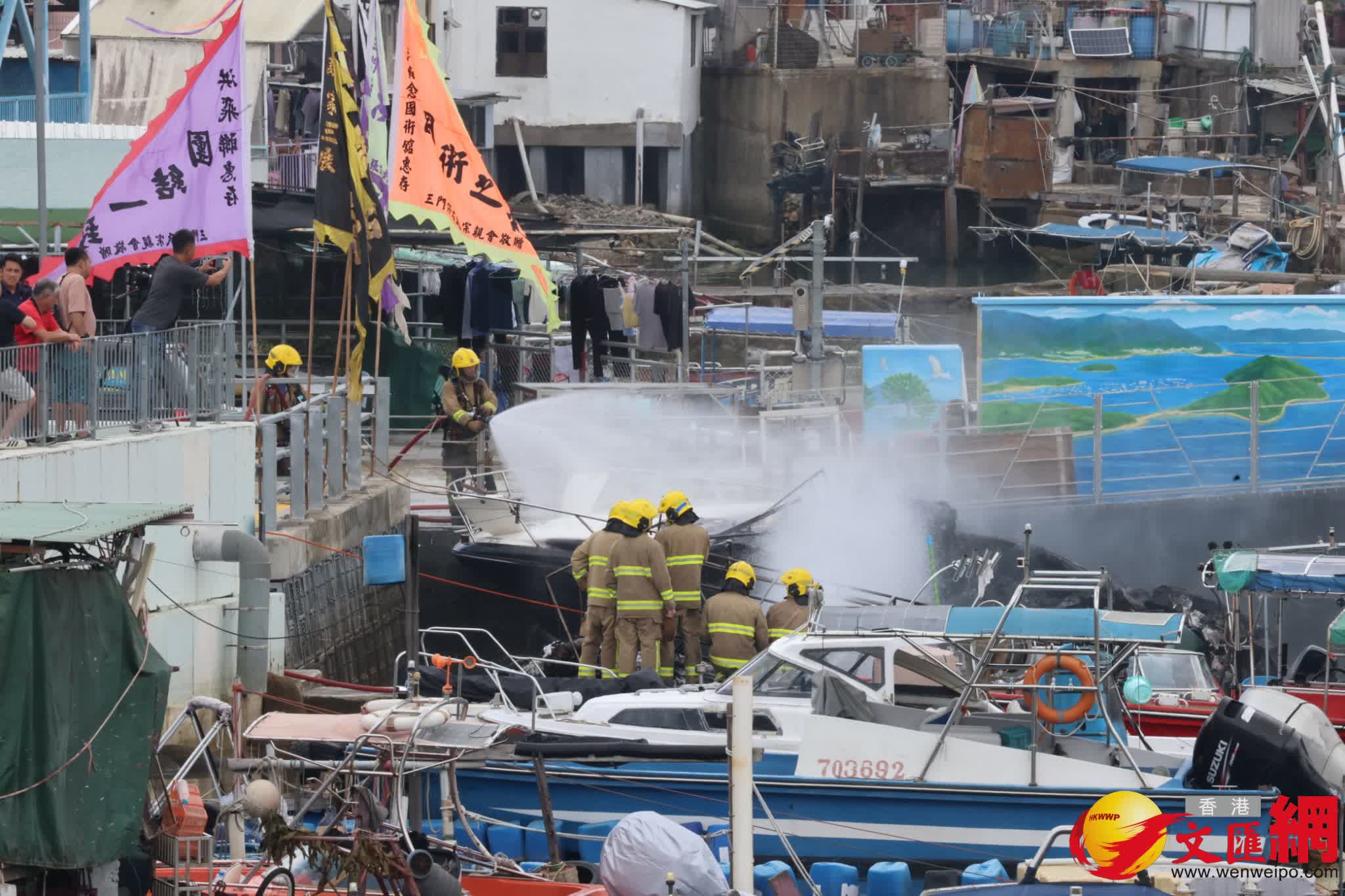 其後消防員奉召到場,迅將4船隻分開及動用一喉及一隊煙帽隊於下午約1時31分將火救熄。香港文匯報記者現場所見,其中兩隻被拖到碼頭岸邊的船隻已被嚴重焚毀入水擱淺傾側,另有兩隻船被拖到碼頭的另一邊,當中白色船身的船隻亦燒毀嚴重,另一隻藍色船身的船隻頂篷已被燒毀。消防現在調查起火原因,初步無人受傷。