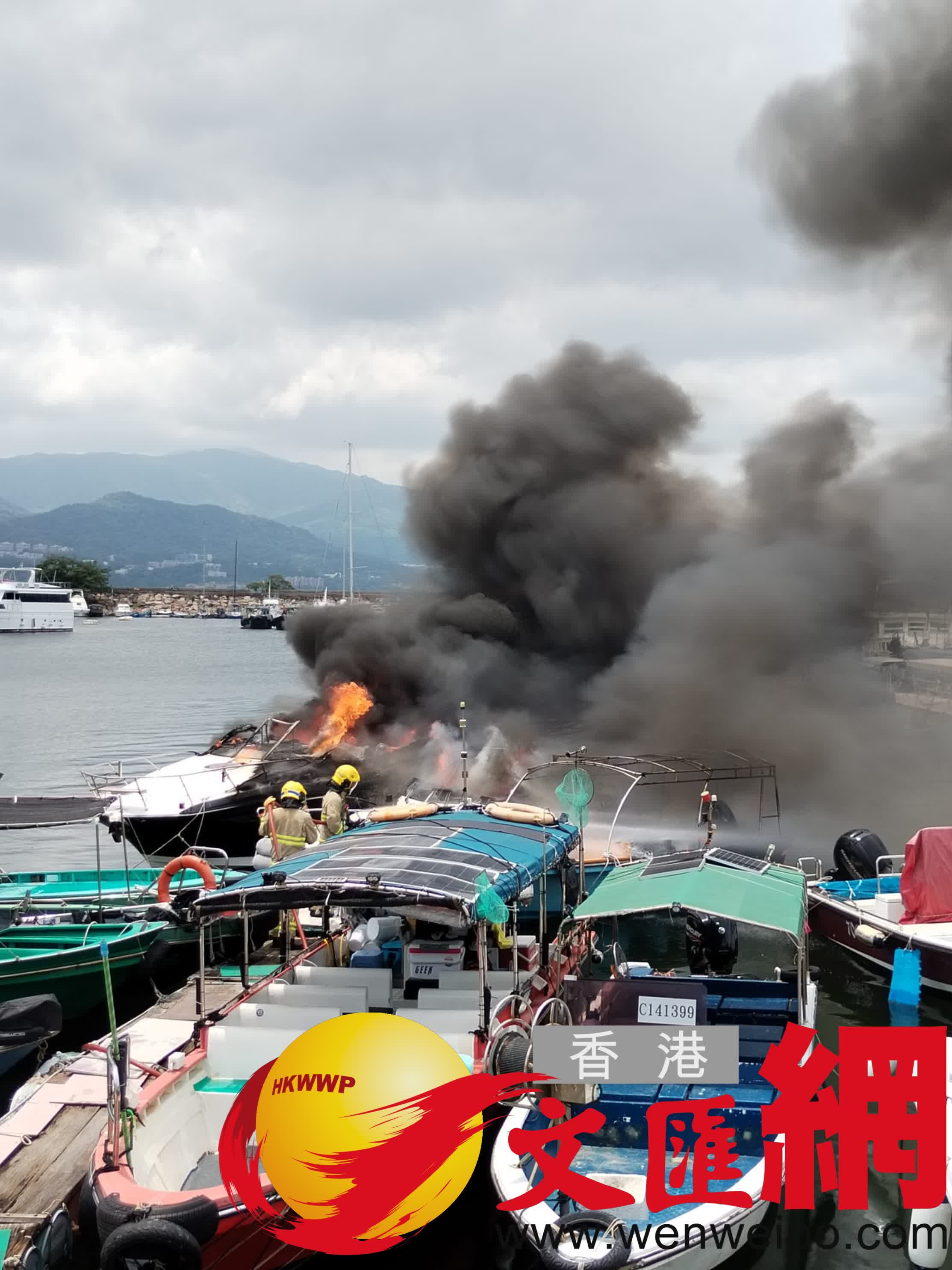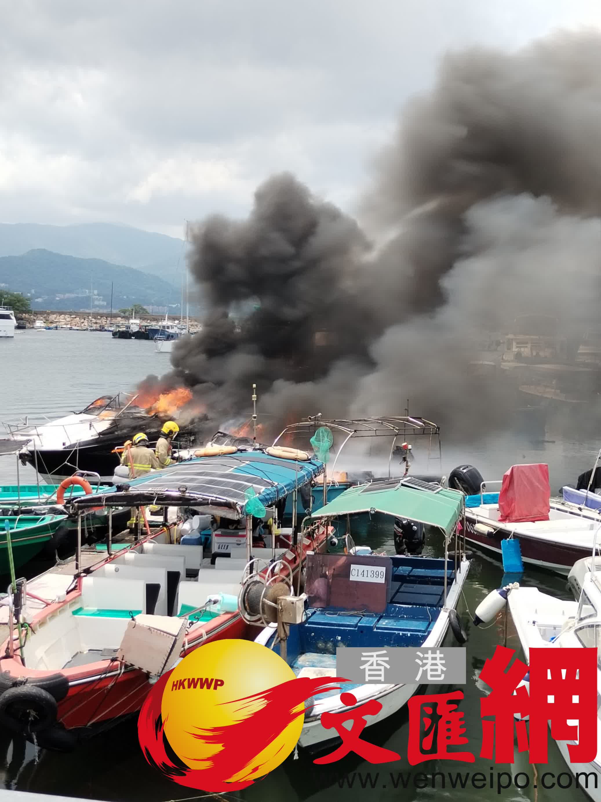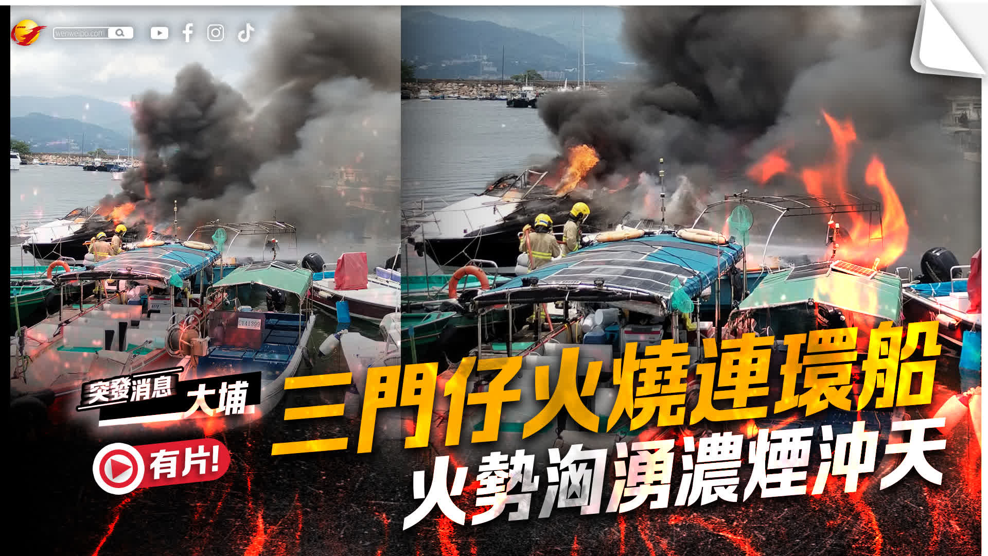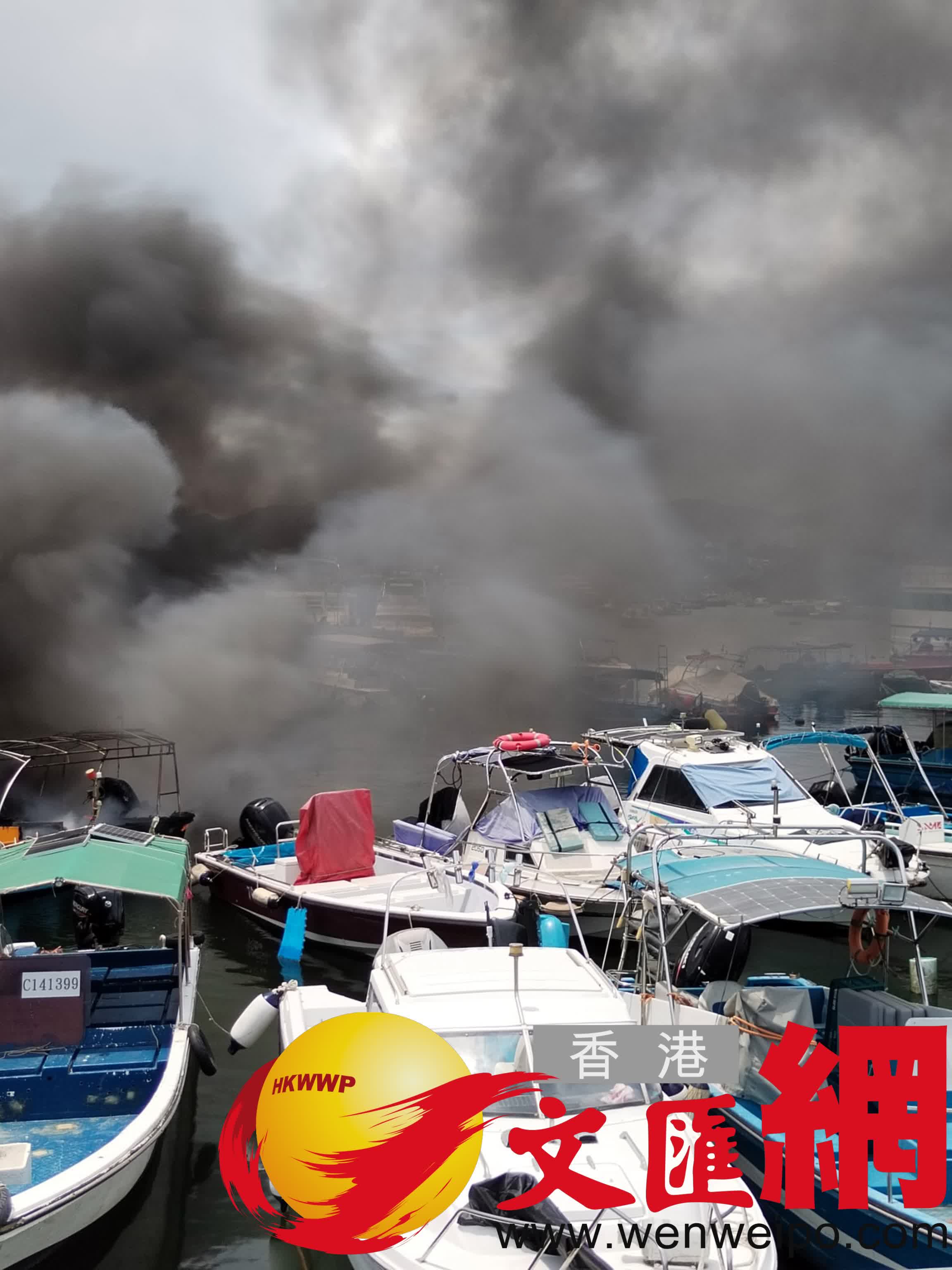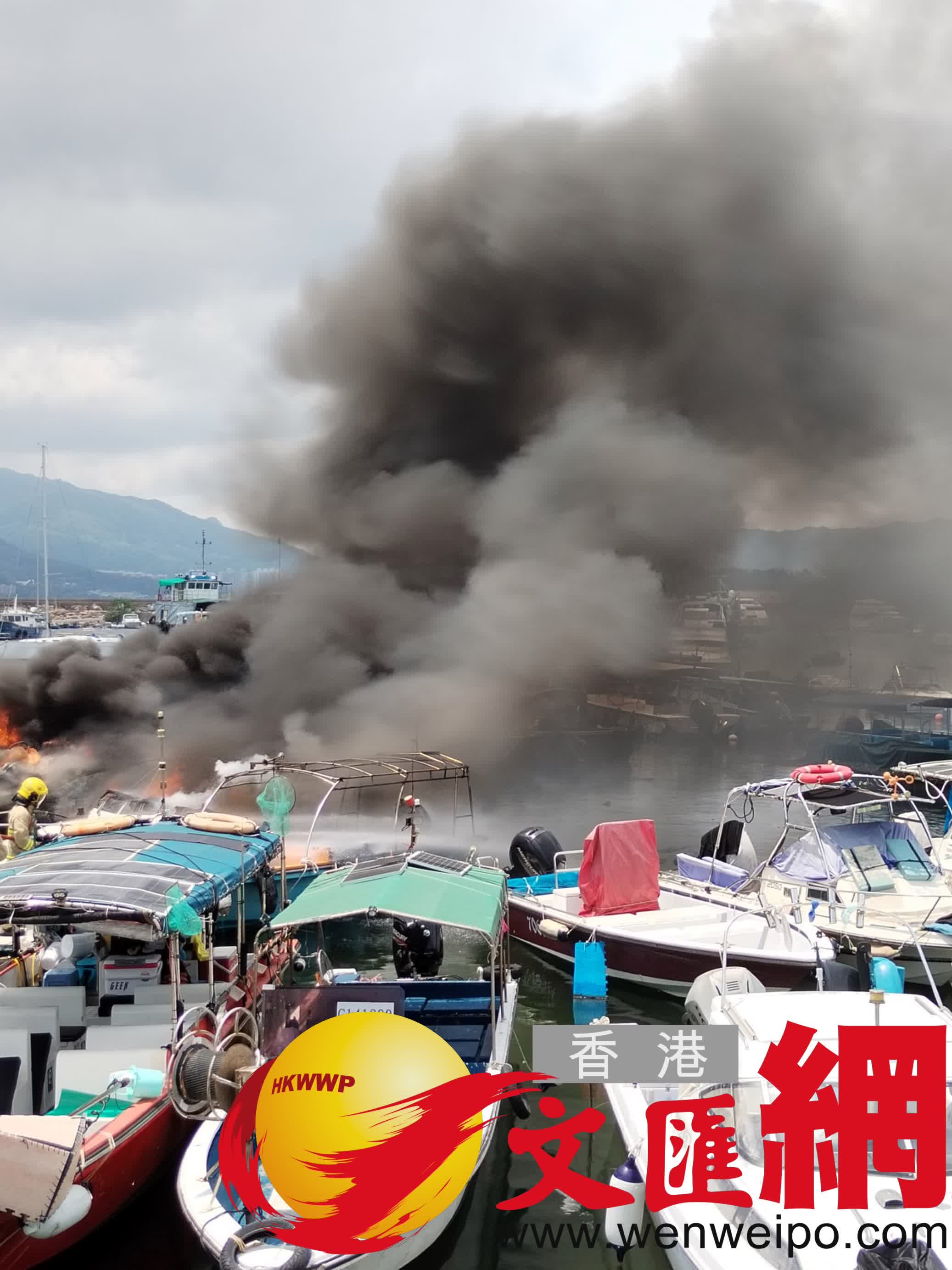 香港文匯報訊(記者 蕭景源)今日(9日)中午約12時,大埔三門仔避風塘海面有船隻起火。由船家拍攝的片段離遠可見有船隻陷入火海,火勢相當猛烈,濃濃黑煙席捲半空,期間更傳出一下巨大的爆炸聲響。據悉現場離岸約200米有快艇首先起火,隨後火勢迅速蔓延波及旁邊另外3隻船釀成火燒連環船,所幸當時船上無人。