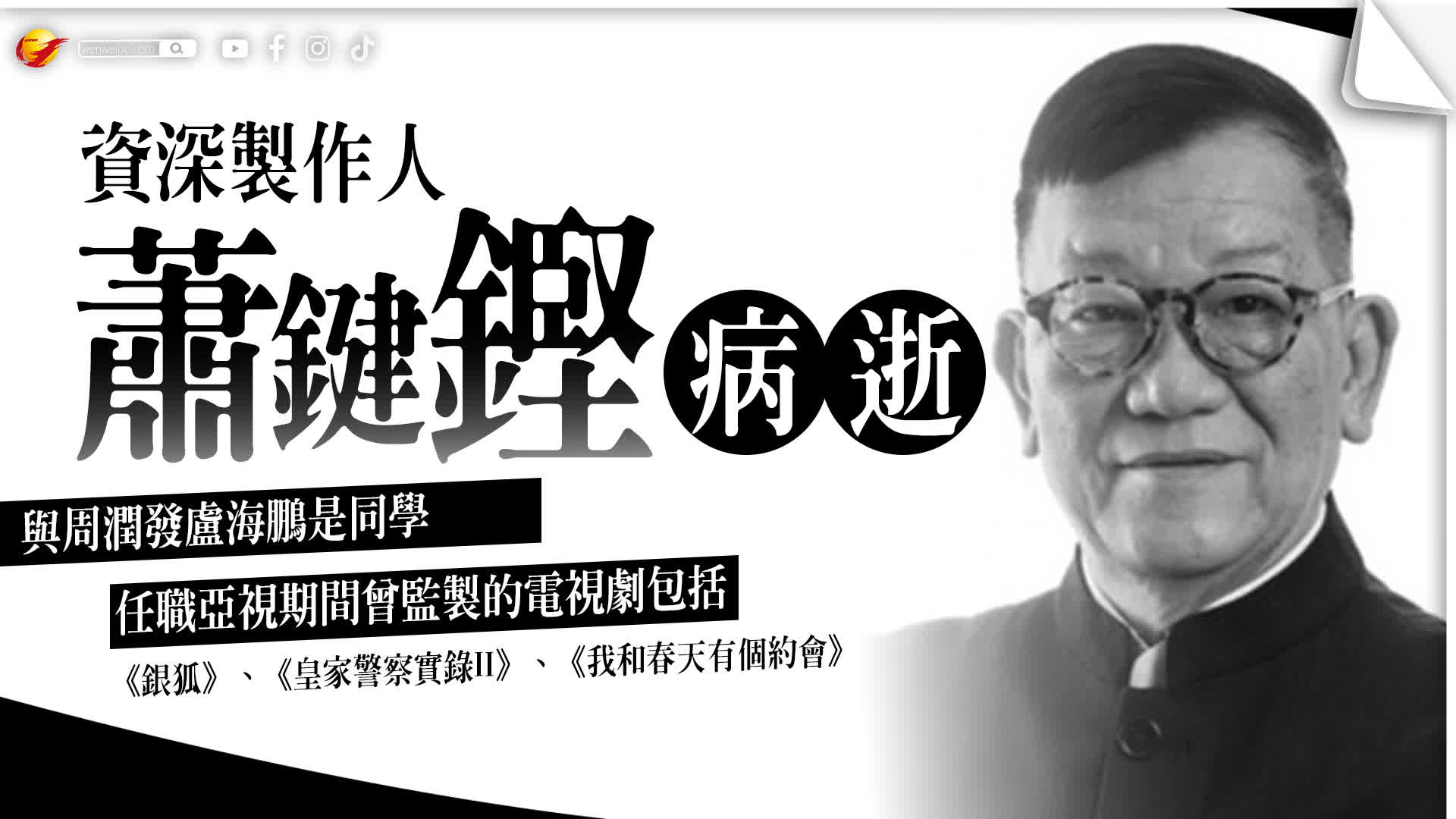 80年代資深製作人蕭鍵鏗(Joseph)昨日(8日)因病離世,享年73歲。其兒子蕭鍵煒在Facebook公布死訊:「老竇畢咗業了,感謝各位,之後的事,會再告知大家。」蕭鍵鏗為周潤發第三期藝訓班同班同學,有指其契媽為藝人羅蘭。