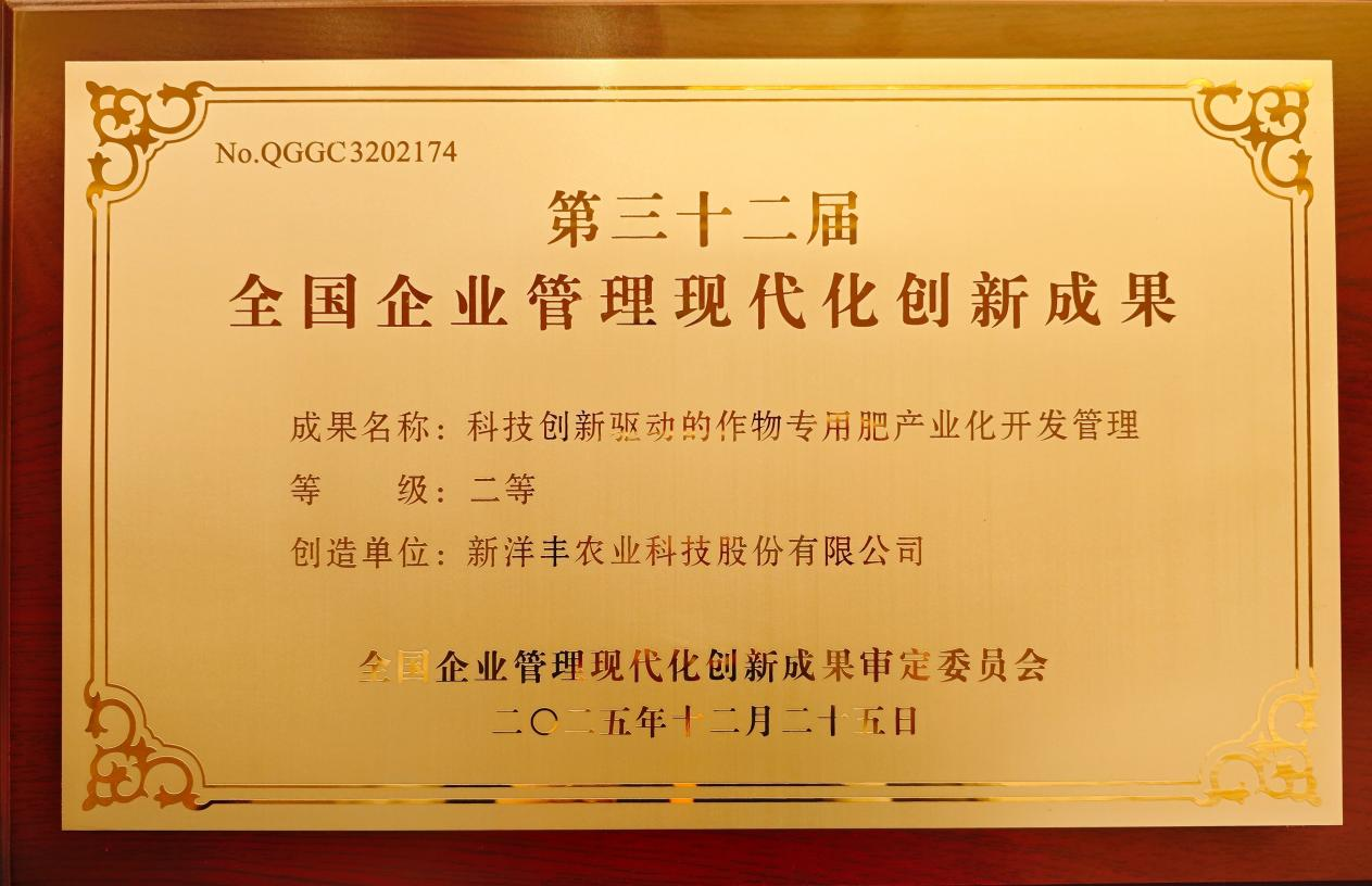 4月9日,2026年全国企业管理创新大会在北京举行,第三十二届全国企业管理现代化创新成果同期发布。新洋丰农业科技股份有限公司凭借《科技创新驱动的作物专用肥产业化开发管理》成果,从全国966项申报成果中脱颖而出,荣获全国企业管理现代化创新成果二等奖。