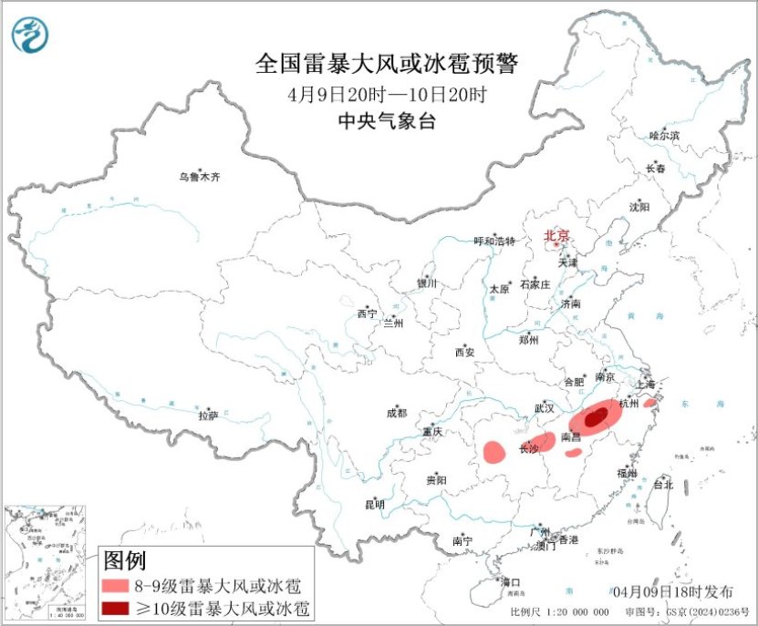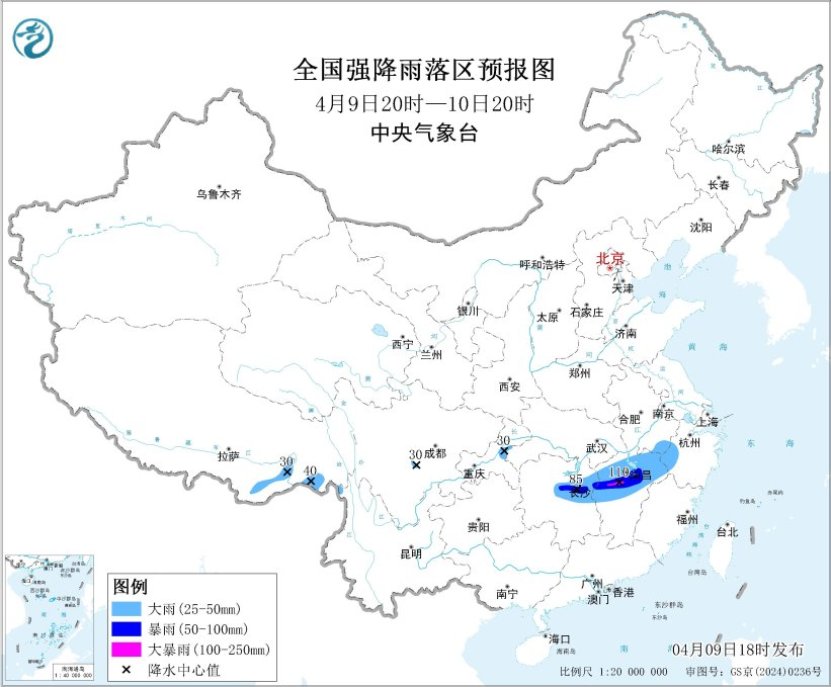 中央气象台4月9日18时继续发布暴雨蓝色预警和发布强对流天气蓝色预警。预计,4月9日20时至10日20时,西藏东南部、四川中部、重庆东部、安徽南部、湖南东部、江西中北部、浙江西部等地部分地区有大到暴雨,其中,江西中部等地部分地区有大暴雨(100~110毫米)。上述部分地区伴有短时强降水(最大小时降雨量20~40毫米,局地可超过50毫米),局地有雷暴大风或冰雹等强对流天气(见图1)。江南中北部等地的部分地区将有8级以上雷暴大风或冰雹天气,其中,安徽南部、江西东北部等地的部分地区将有10级以上雷暴大风,最大风力可达11级以上(见图2)。