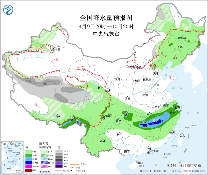 4月9日20时至10日20时,新疆北疆西部、新疆南疆西部和南部、内蒙古东部、黑龙江西部、西藏北部和东部、青海中南部等地部分地区有小到中雪或雨夹雪,局地大雪;黑龙江南部、吉林西部、西藏东南部、四川中部、重庆中部、江淮南部、江南北部等地部分地区有中到大雨,其中,湖南东部、江西中部等地部分地区有暴雨或大暴雨(100~110毫米)。上述部分地区伴有短时强降水(最大小时降雨量20~40毫米,局地可超过50毫米),局地有雷暴大风或冰雹等强对流天气。内蒙古中东部、新疆东部、甘肃西部、西藏中南部等地部分地区有4~6级风,其中,内蒙古中东部部分地区有6~7级风,东海北部和西南部海域有7级风、阵风8级(见图5)。
