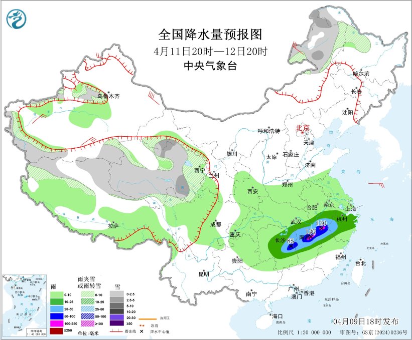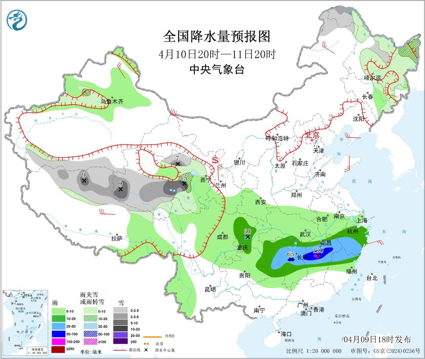 4月10日20时至11日20时,内蒙古东北部、东北地区东部和北部、新疆沿天山地区和南疆盆地、西藏西部、青海等地部分地区有小到中雪或雨夹雪,其中,青海等地部分地区有大到暴雪(10~15毫米)。江南大部、四川盆地东北部、重庆西部等地部分地区有中到大雨,其中,湖南中部、江西中部等地部分地区有暴雨或大暴雨(100~120毫米)。内蒙古东北部、吉林东部、辽东半岛、新疆北疆东部、西藏北部、甘肃河西、山东半岛等地部分地区有4~6级风,其中,内蒙古西北部部分地区有6~7级风(见图6)。