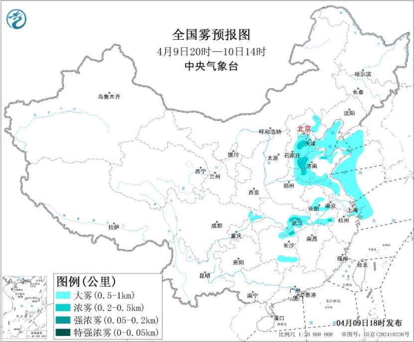 中央气象台4月9日18时继续发布大雾黄色预警。预计,4月9日夜间至10日上午,渤海、渤海海峡、黄海北部和西部海域、东海西北部海域、长江口附近海域将有能见度不足1公里的大雾。此外,河北中南部、北京南部、天津西部、河南东北部、山东西部和北部、江苏北部、安徽中南部、湖北东部、湖南东北部等地的部分地区有大雾天气,局地有能见度不足500米的浓雾(见图4)。