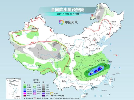 11日:暖湿气流再度增强,强降雨带范围有所扩大,湖南中部、江西中部等地有大到暴雨,江西局地大暴雨。