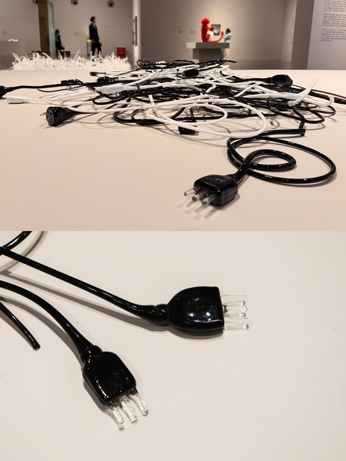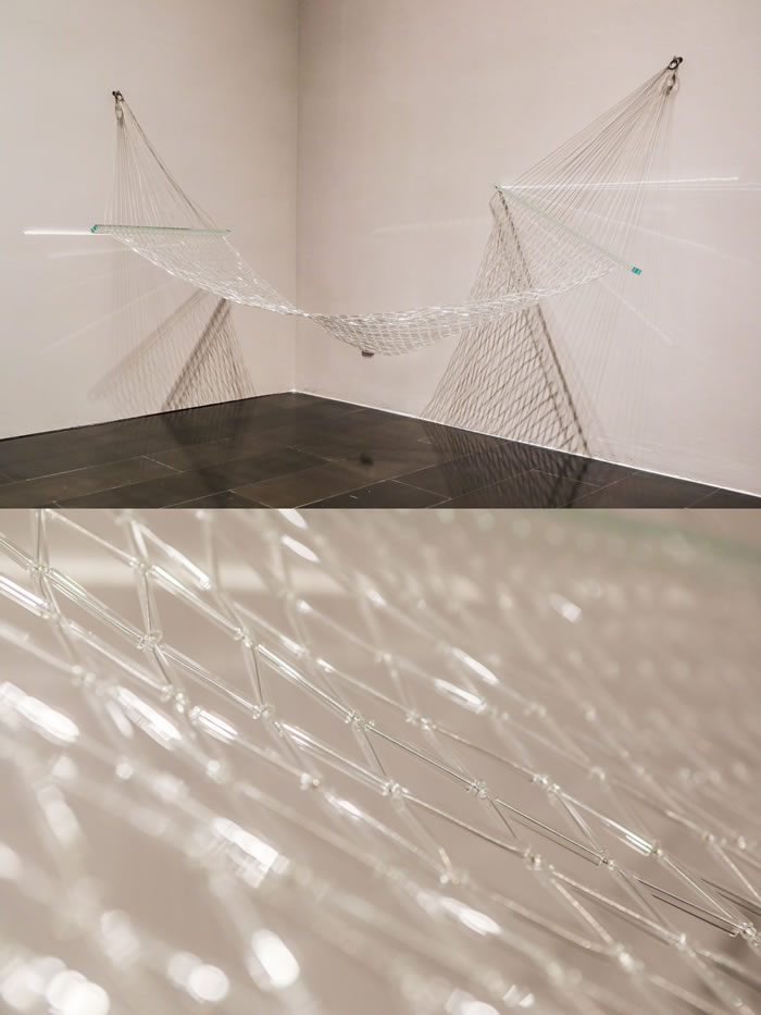 另一批艺术家更加关注玻璃材质特性与日常经验的反叛试验:他们用玻璃塑造富有弹性的吊床,柔韧的电线、灵活蠕动的鳗鱼、蓬松柔软的垫子、坚硬结实的脚手架、阻碍功能的金属隔离栏、坚不可摧的铠甲或是充满暴力与欲望的黑色皮制链条......