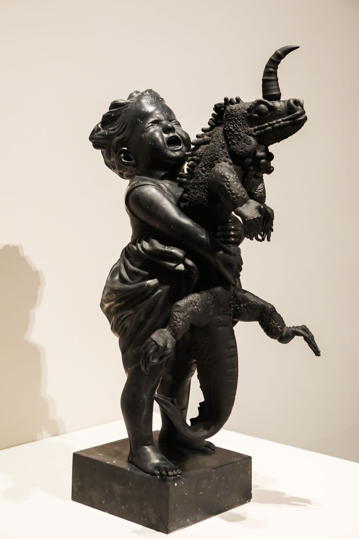 中国艺术家白明将玻璃的通透与陶瓷的质朴相结合,在《瓷上软语》中通过玻璃的“软”与陶瓷的“硬”的碰撞,不仅展现了两种材料的工艺特性,也传递出“刚柔并济”的东方哲思;比利时艺术家昆·范梅赫伦(Koen Vanmechelen)则尝试将大理石与玻璃相融合,在其作品《世界化石I》中,一个大理石雕刻的古典孩童形象怀抱着一个试图从其双臂中挣脱的玻璃制的蜥蜴与独角兽结合的超现实生物,这样的奇幻组合隐喻着人与自然,本土与外来物种的关系,而“化石”的标题则暗喻了时间、进化与文明更迭的思考。