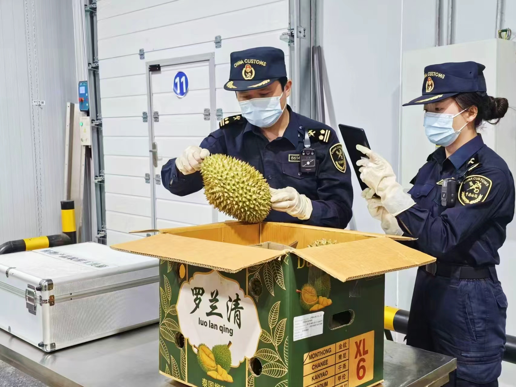 海关关员在磨憨铁路口岸对进口榴莲进行查验。周炜 摄