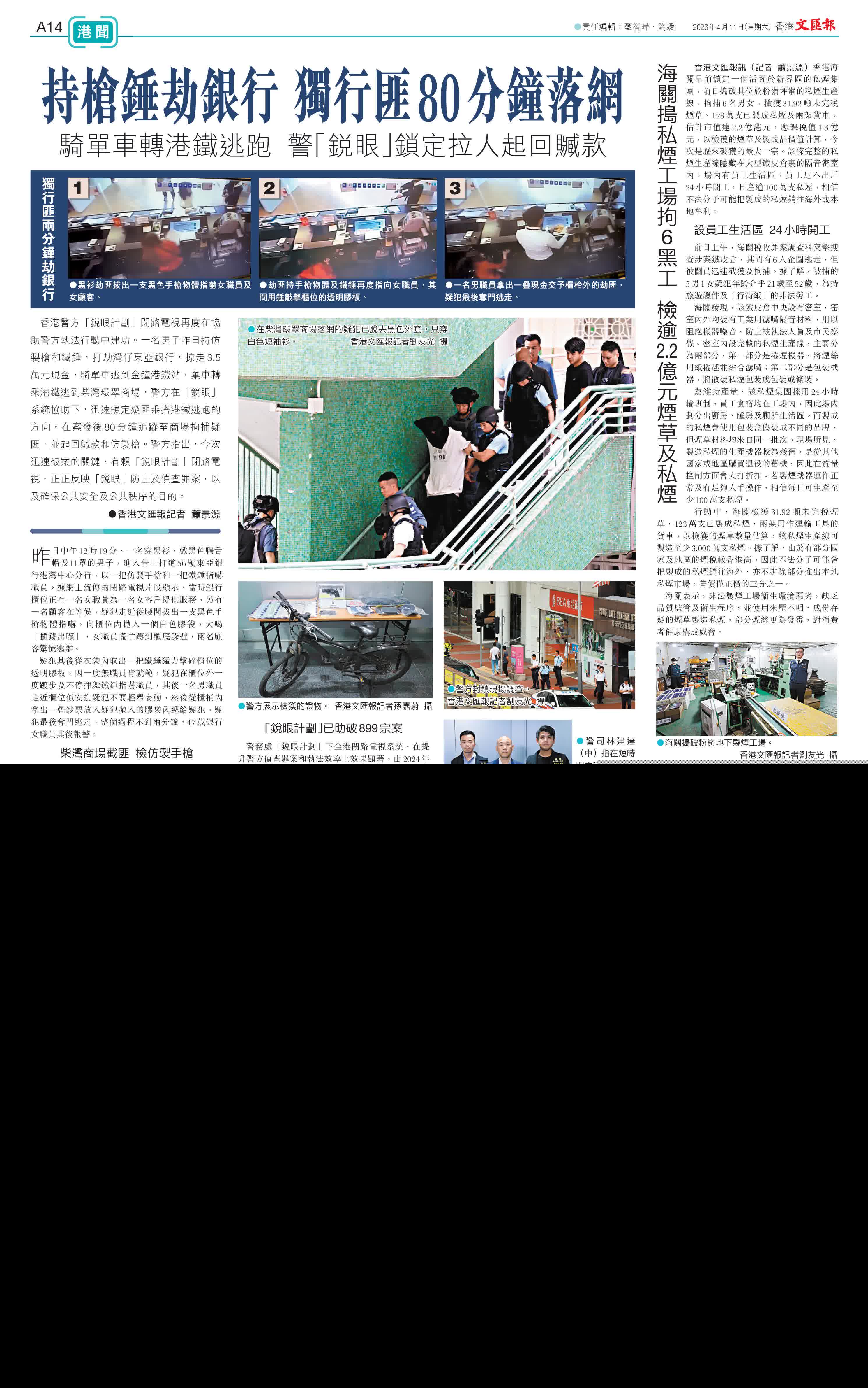 (香港文匯報記者 蕭景源)香港警方「銳眼計劃」閉路電視再度在協助警方執法行動中建功。一名男子昨日持仿製槍和鐵錘,打劫灣仔東亞銀行,掠走3.5萬元現金,騎單車逃到金鐘港鐵站,棄車轉乘港鐵逃到柴灣環翠商場,警方在「銳眼」系統協助下,迅速鎖定疑匪乘搭港鐵逃跑的方向,在案發後80分鐘追蹤至商場拘捕疑匪,並起回贓款和仿製槍。警方指出,今次迅速破案的關鍵,有賴「銳眼計劃」閉路電視,正正反映「銳眼」防止及偵查罪案,以及確保公共安全及公共秩序的目的。