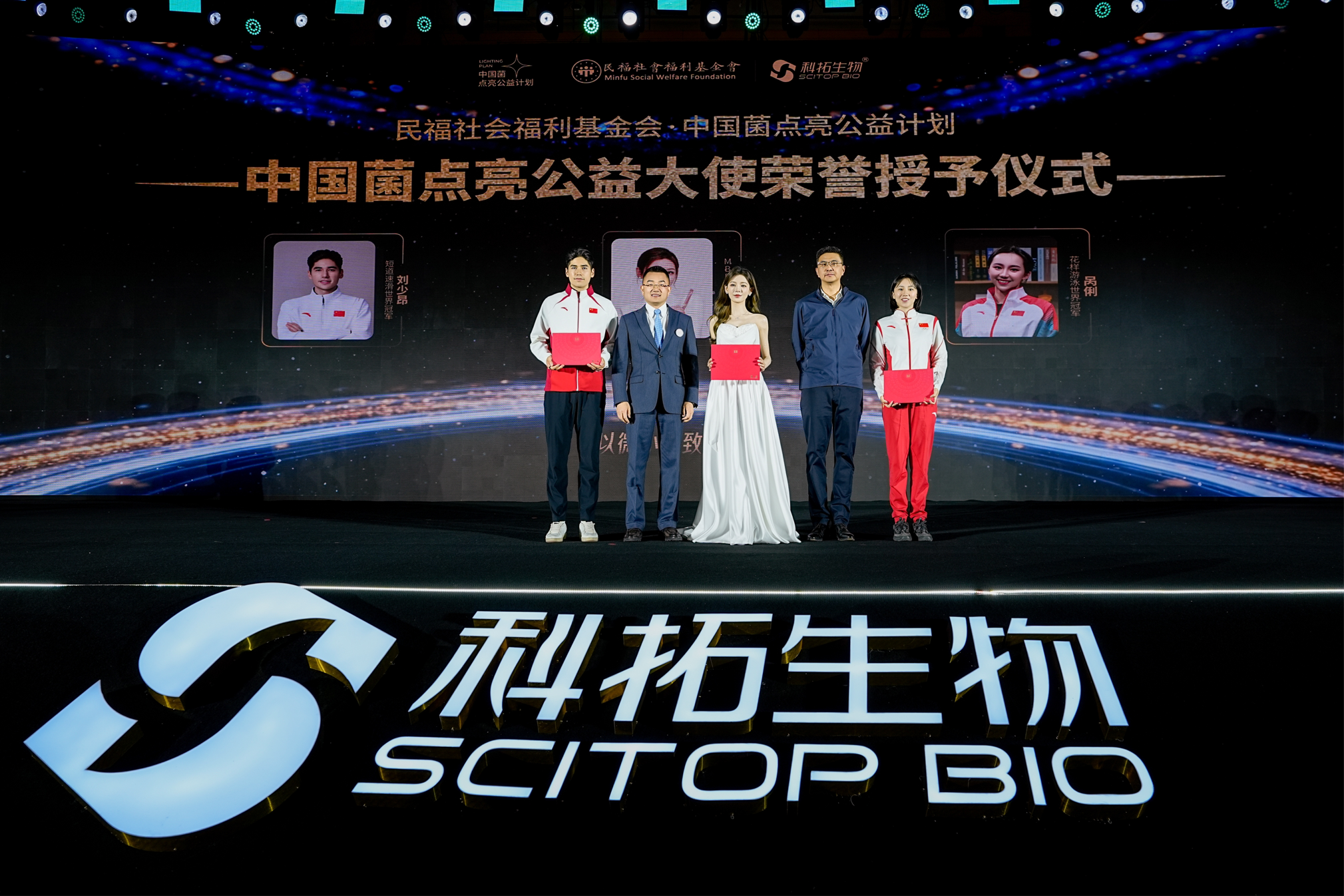 活动现场"中国菌·点亮公益计划"正式启动,民福社会福利基金会授予花样游泳世界冠军呙俐,短道速滑世界冠军刘少昂,MBB品牌代言人张予曦"中国菌点亮公益大使"称号。该公益计划承诺:科拓生物每售出一条益生菌产品,即向留守儿童捐赠一分钱,以点滴爱心点亮希望之光。