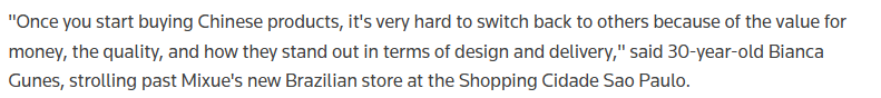 报道指出,近期,一家中国新式茶饮与冰品连锁品牌在巴西开设首店,标志着中国企业新一轮进入巴西市场的重心,已开始面向巴西这个拥有2亿多人口的庞大市场,直接布局消费端。路透社认为,这既是中企海外投资的新阶段,也反映出中国与巴西紧密的经济联系持续巩固夯实。