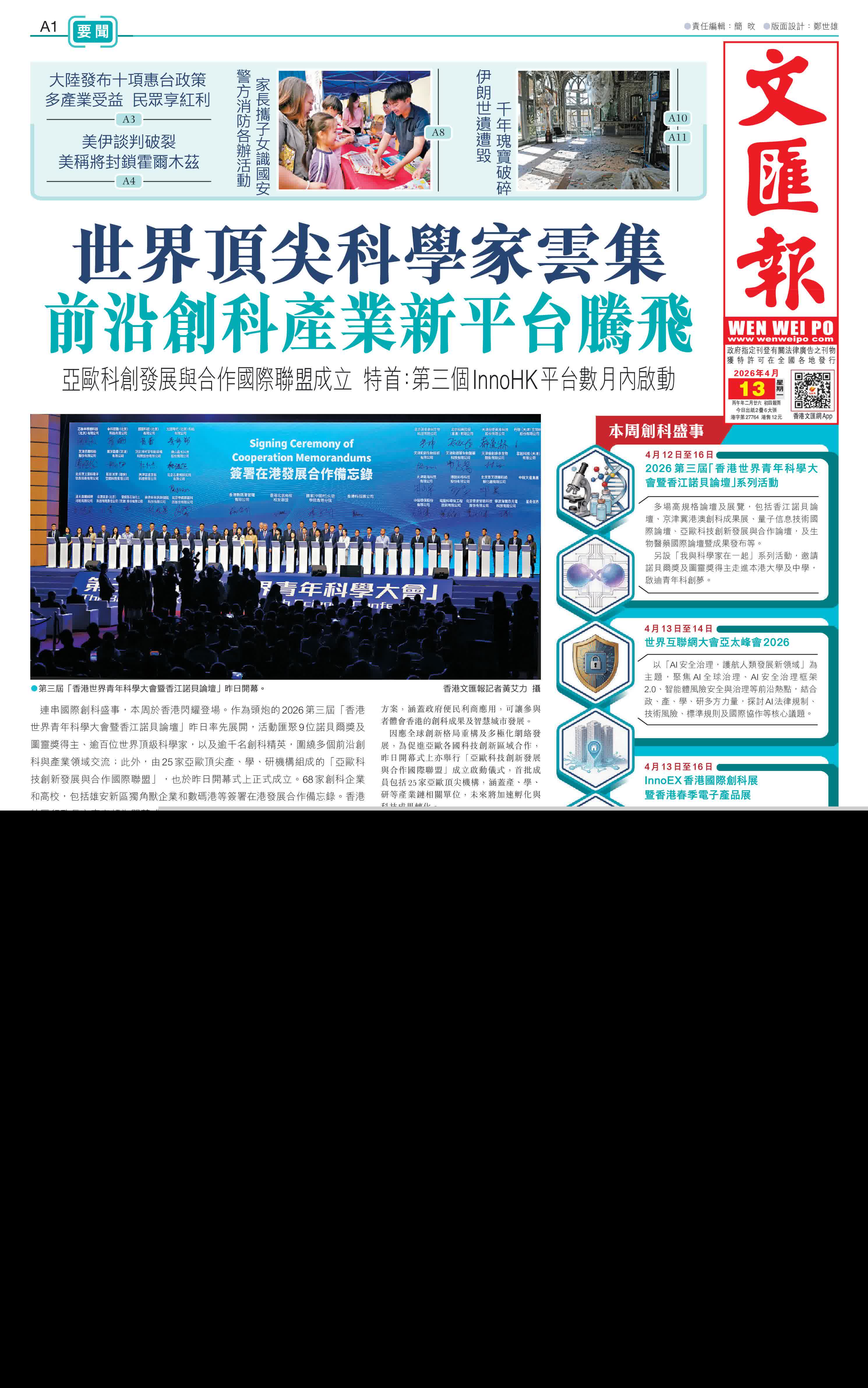 國家「十五五」規劃明確支持香港建設國際創科中心及高端人才集聚高地,高質量的創科盛事,是匯聚人才、展示香港國際化優勢與前沿科研實力的關鍵環節。作為2026香港國際創科營商周(BIT Week)的首項活動,由香港北京高校校友聯盟主辦、以「與世界協創未來」為主題的第三屆「香港世界青年科學大會暨香江諾貝論壇」,昨日起一連五天舉行,吸引全球創科精英就人工智能(AI)、具身機器人、生物醫藥、量子科技、綠色能源等前沿領域及未來產業的發展趨勢與合作模式展開深入交流。