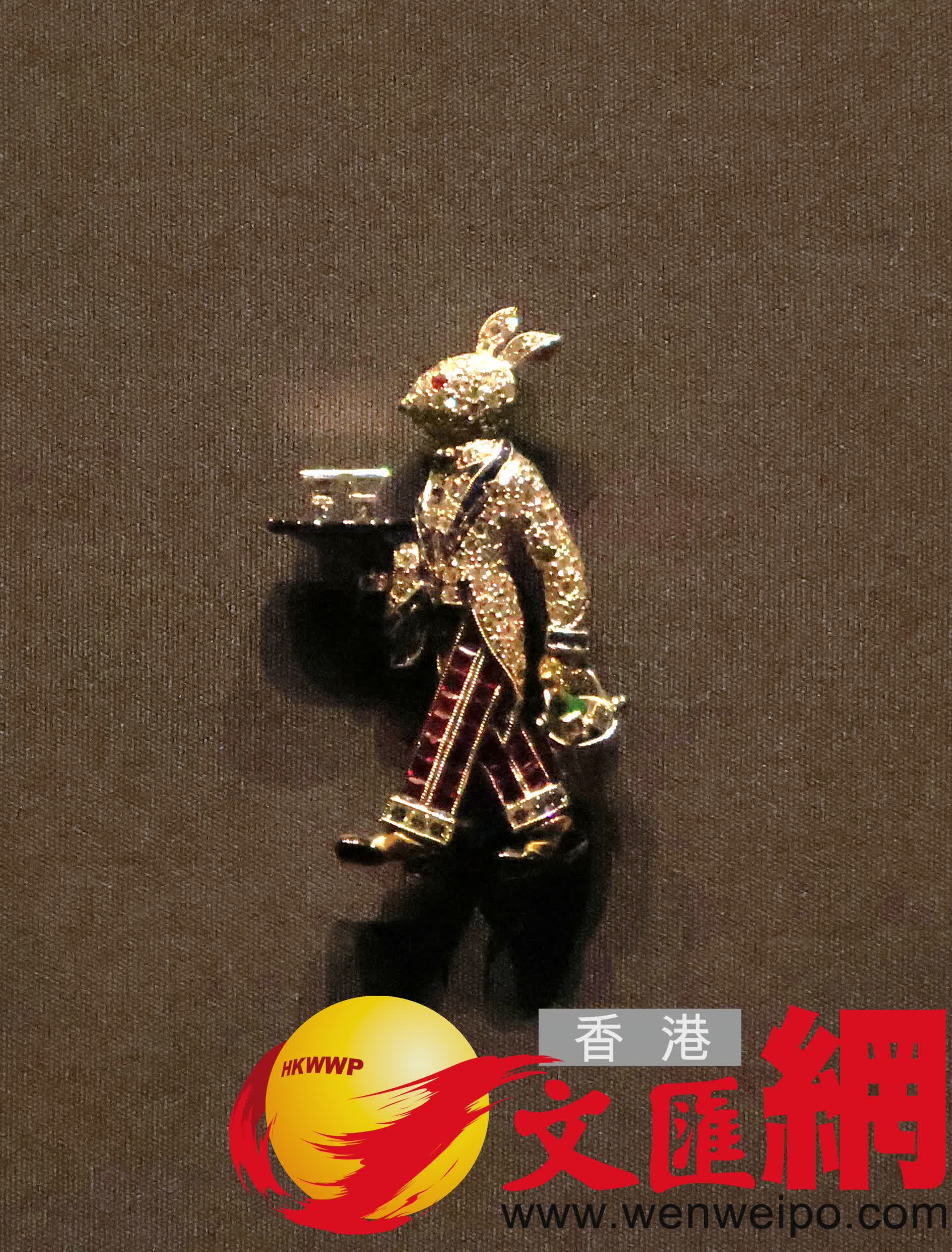 展品中亦有數枚引人注目的胸針,其中一枚可能為出自紐約知名珠寶品牌蒂芙尼的胸針(約1900年),以方形祖母綠為主石,四周鑲嵌梨形的明亮式切割鑽石,採用20世紀初新興的鉑金為鑲托材質;另一件亮點則是由紐約頂級珠寶工匠雷蒙德·C·雅德創作的別緻兔子胸針(約1930年),手持雞尾酒托盤的兔子服務生造型俏皮幽默,充分展現珠寶設計師的想像力與技藝。