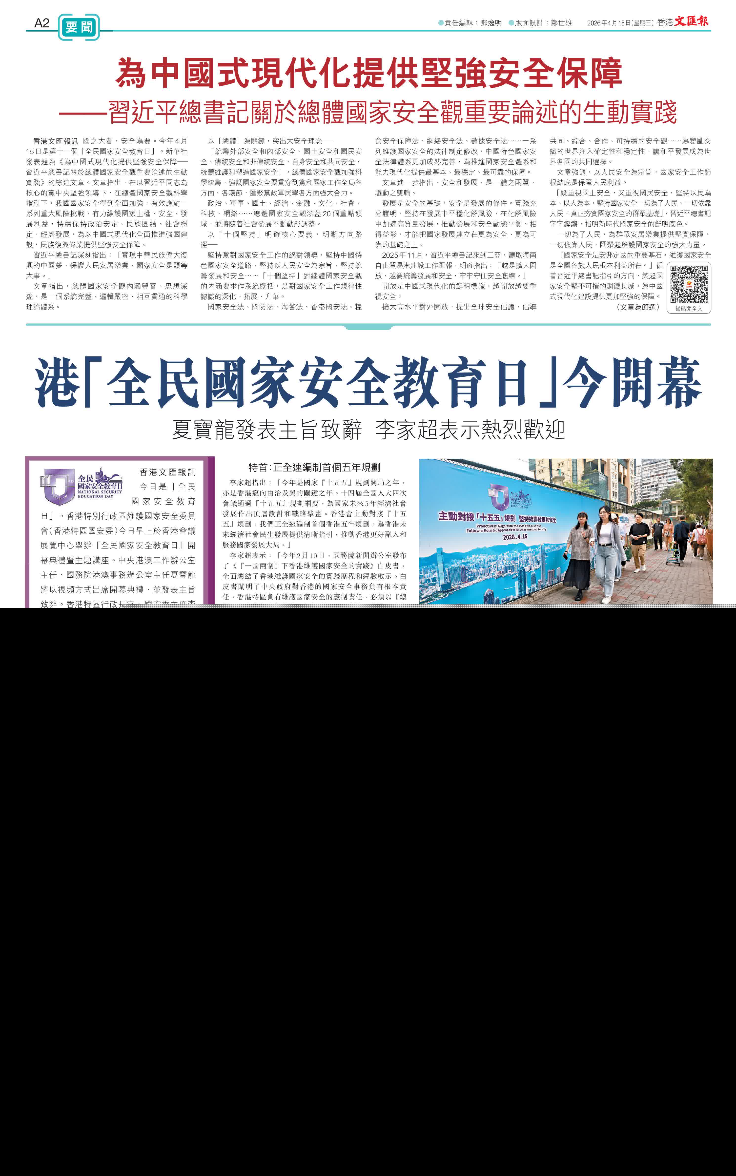 今日是「全民國家安全教育日」,正值國家「十五五」規劃開局之年,也處於香港拚經濟、促發展,開創新局面的關鍵時刻。十四屆全國人大四次會議上月通過「十五五」規劃綱要,支持香港鞏固提升國際金融、航運、貿易中心和國際航空樞紐地位,強化全球離岸人民幣業務樞紐、國際資產及財富管理中心、國際風險管理中心功能,構建大宗商品交易生態圈和高增值供應鏈服務中心。支持香港建設國際創新科技中心,深化國際法律及解決爭議服務中心、區域知識產權貿易中心、中外文化藝術交流中心建設,加快北部都會區建設,支持香港打造國際高端人才集聚高地。