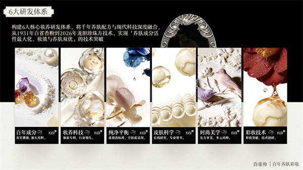 百雀羚此次回归彩妆的背后,是一套完整的科研体系支撑。品牌构建了赛道内独有的“六维一体养肤彩妆研发体系”,实现了从百年成分、纯净平衡、妆养科技到皮肤科学、国妆美学、彩妆技术的全链路闭环。