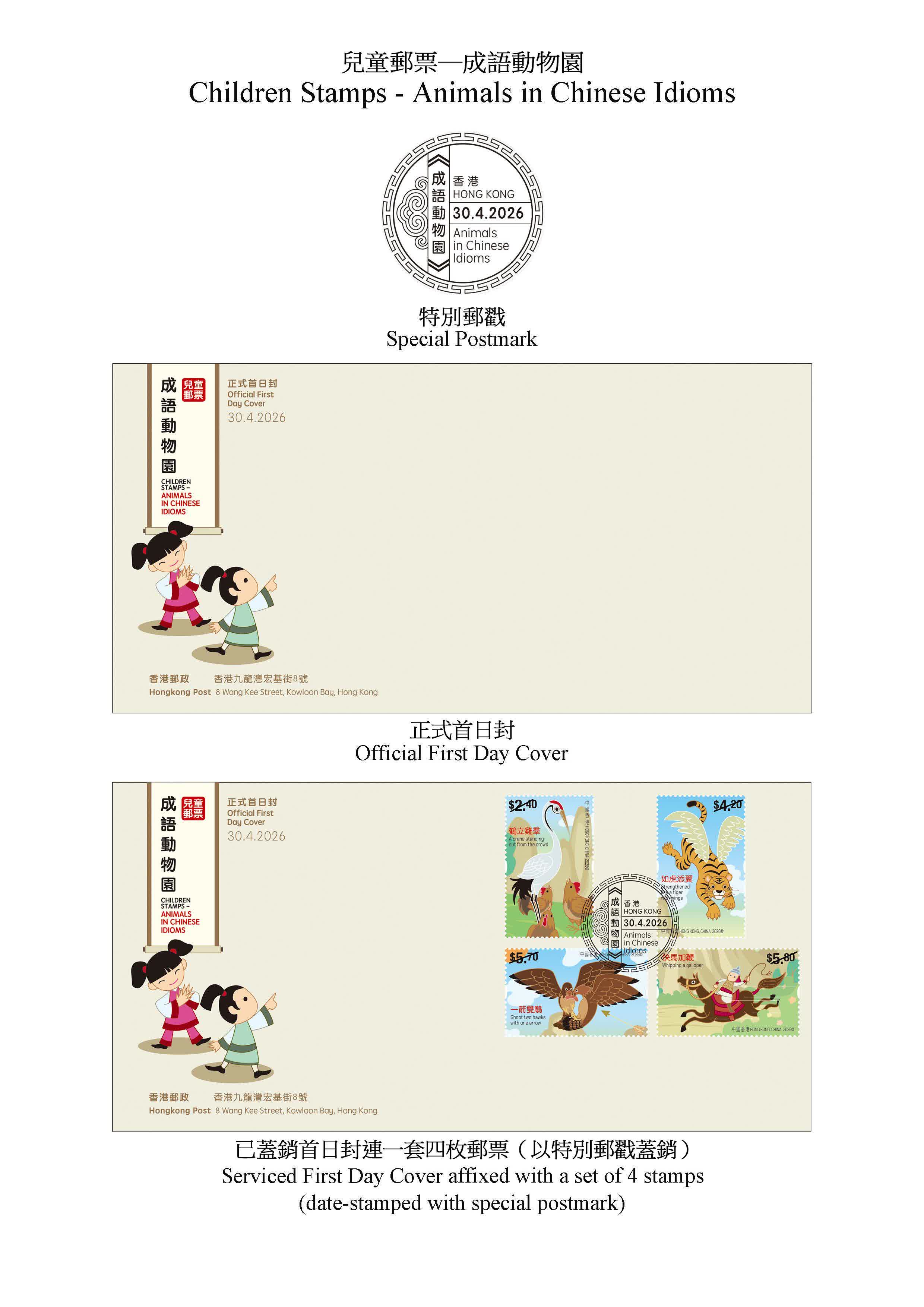 全線郵政局和香港郵政網上購物平台「郵購網」(shopthrupost.hongkongpost.hk)由明日(16日)起發售「兒童郵票—成語動物園」正式首日封。這套特別郵票及相關郵品將於4月30日起在各郵政局及「郵購網」發售,而貼有特別郵票的已蓋銷首日封只限在集郵局發售。