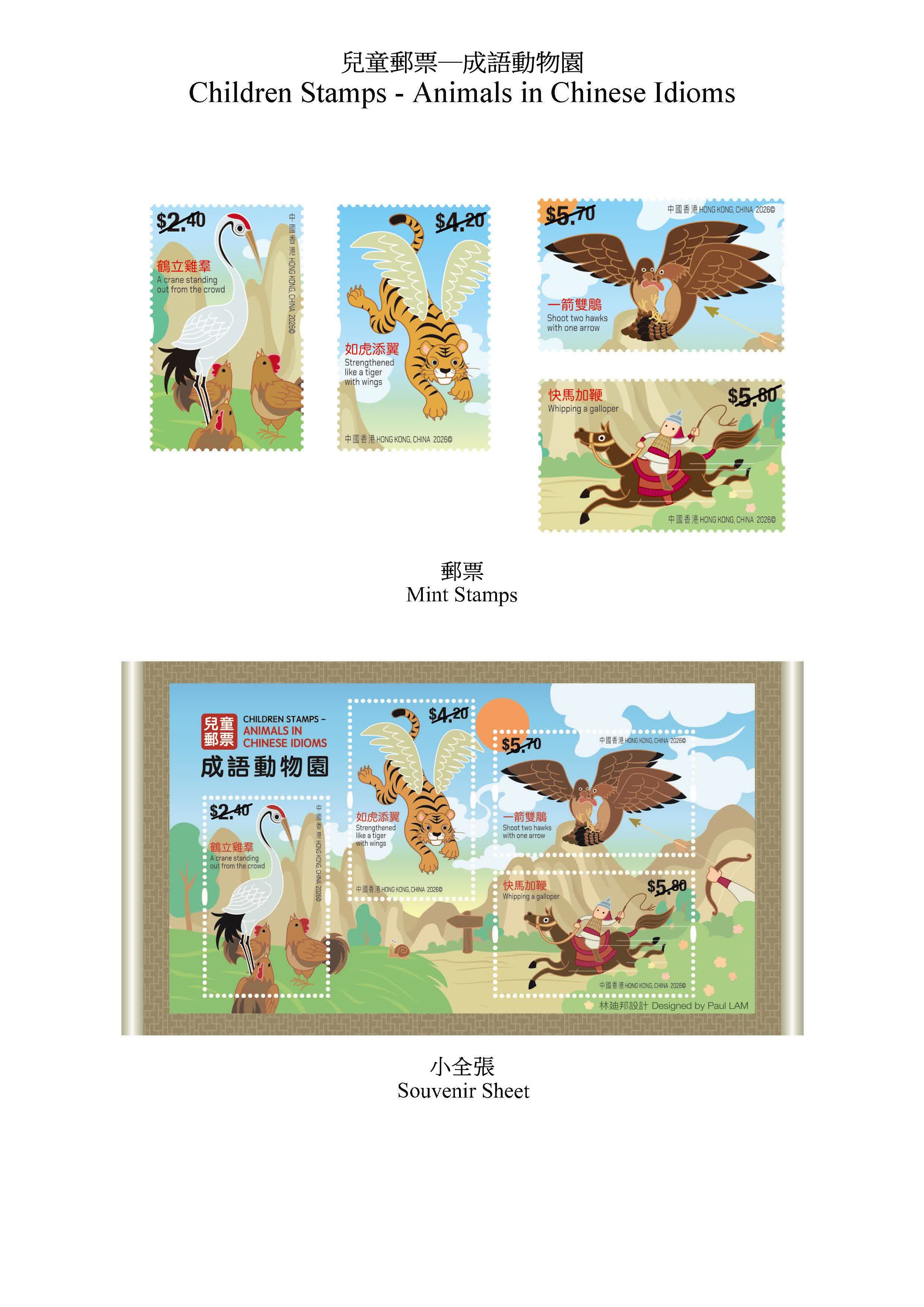 成語是漢語特有的一種語言形式,以一些相習沿用的特殊詞組或短語,表達固定的語意。成語言簡意賅、蘊含人生哲理,是語文學習與文化傳承的重要資源。香港郵政將以「兒童郵票—成語動物園」為題發行一套四枚郵票及相關郵品,以生動的插圖形象化地呈現包含動物元素的成語,旨在提升兒童對中國語文的認識和興趣,啓發他們的正向思維。