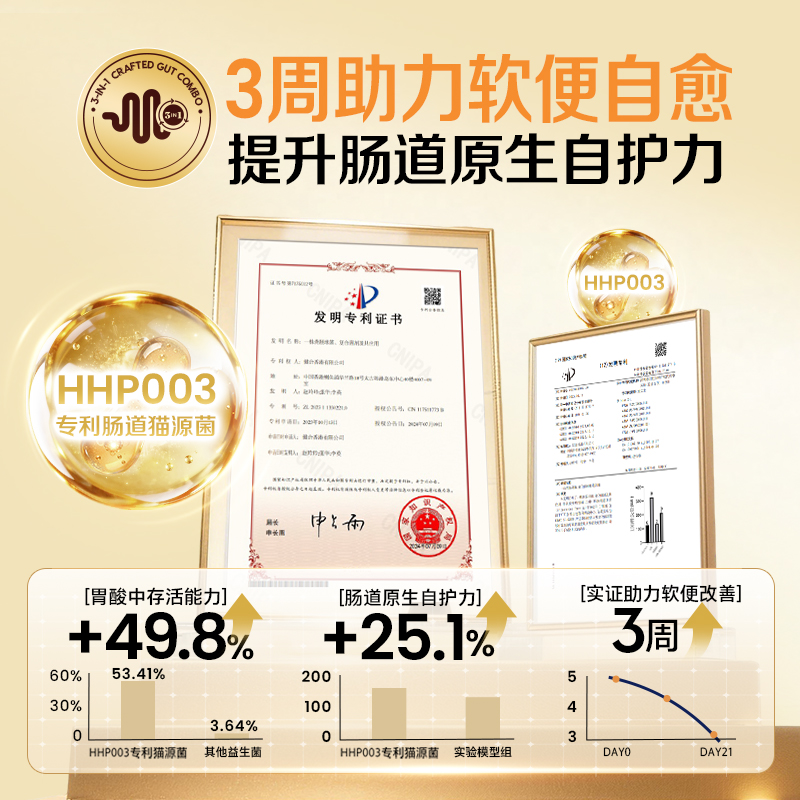 作为真正的猫咪肠道“原住民”益生菌,素力高专利肠道猫源菌HHP003,天然具备更安全、更温和的优势,不打破固有肠道菌群平衡,能够更好地耐受猫咪胃肠道的酸碱度及胆汁酸浓度等独特环境,在胃酸中存活能力提升49.8%,并能更顺利地附着在猫咪肠壁上建立稳定菌落,发挥持久作用,帮助肠道原生自护力增加25.1%。经过3周喂养实证,可有效改善猫咪软便问题,让猫咪在吃好喝好的同时代谢在线,吃出轻盈好体态,守护长期健康。
