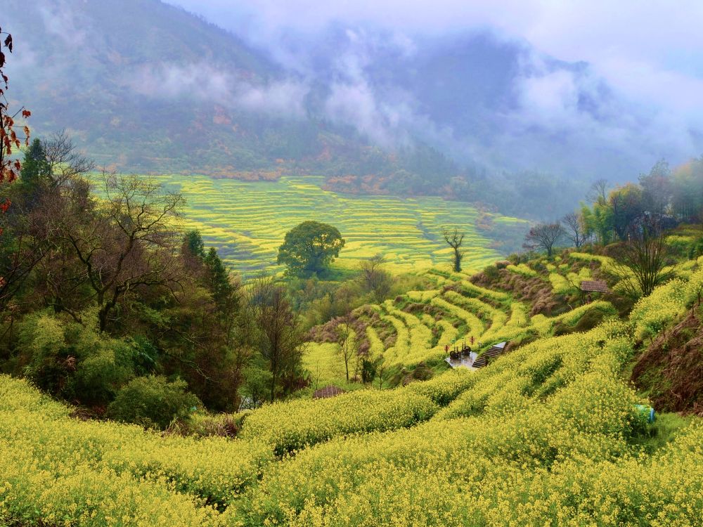 清晨的婺源江岭景区,晨雾刚刚散去,万亩梯田便在春光里铺展开来,金黄的油菜花顺着山势层层叠叠涌向山脚。