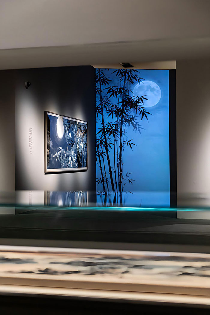 在谈到他以水面、月光、湖上汀州为灵感创作的现代水墨作品时,刘墉分享了他对唐代诗人王维的解读:“王维写‘清泉石上流’,写‘竹喧归浣女’,他不直接写浣女,只写竹林的喧响,这就是‘不着一物,尽得风流’。”以此为启发,刘墉的现代水墨作品将自己的画面切割、重组,加入线的元素,正是试图在现代视觉语境下,重现古典诗学的含蓄与张力。这正是展览着力营造的“温度”所在。它不是一个冷冰冰的学术陈列,而是一场可观、可游、可品的诗性体验。观众看到的不仅是画,更是一位文学家如何用视觉语言“写”出的诗。
